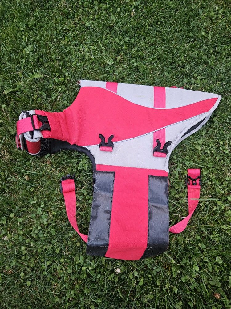 Dog XL life jacket. All buckets and snaps are in great condition. The top jacket handle is broken on one end. Only used three times. Red and gray color.