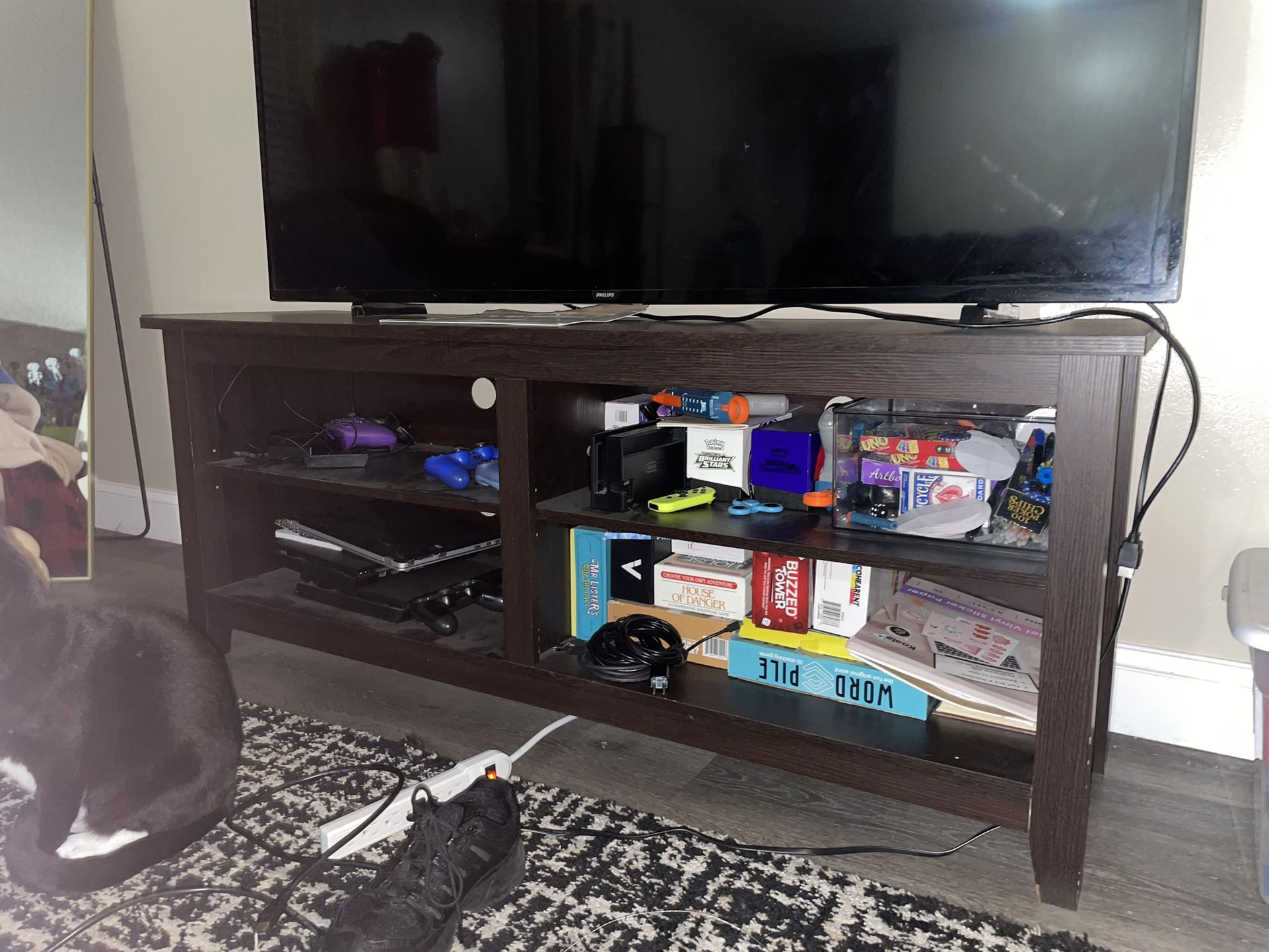 5x2x1 Dark brown wood Holes for cords where cubbies are