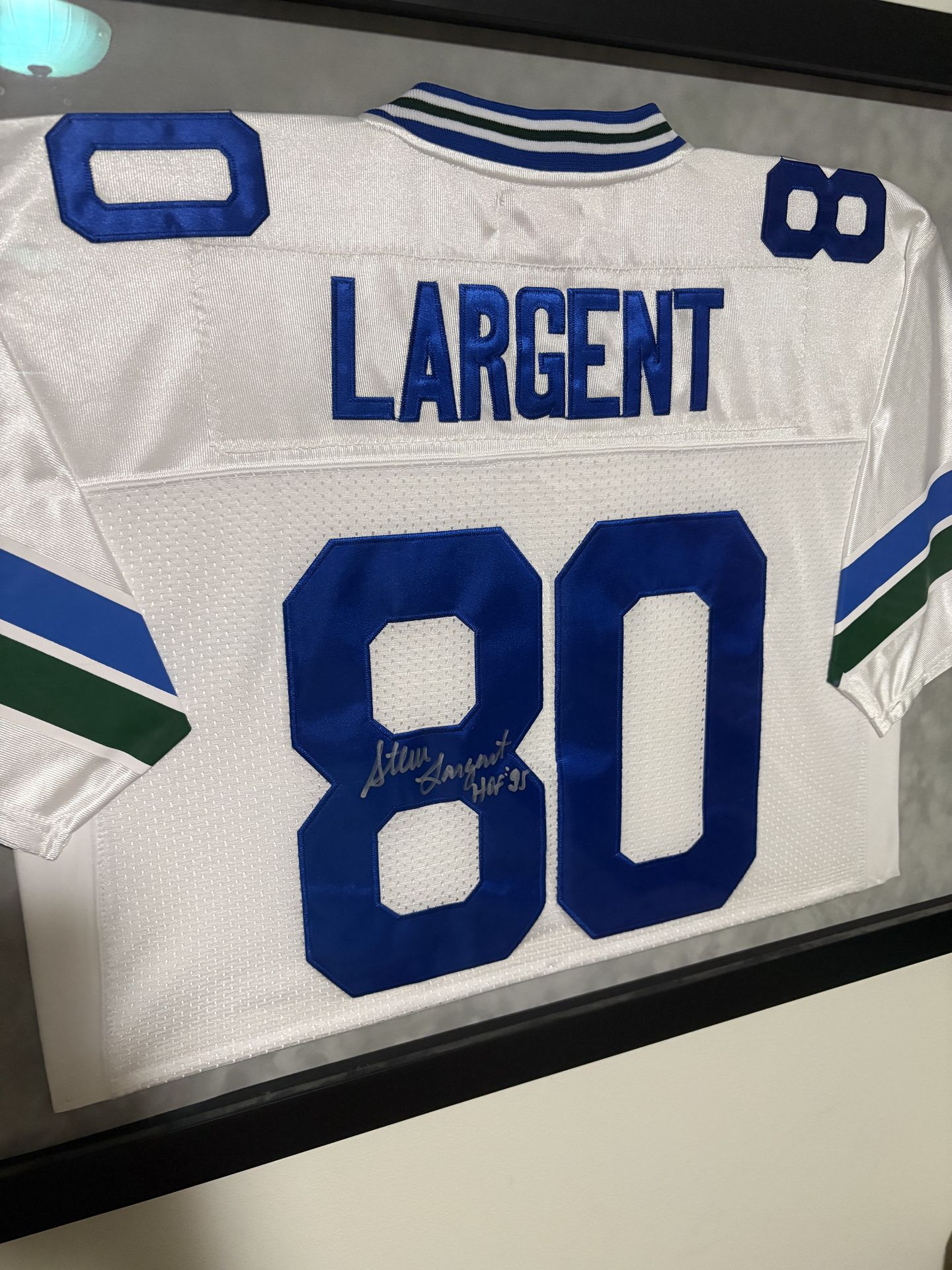 This is an in person autographed framed Steve Largent jersey.