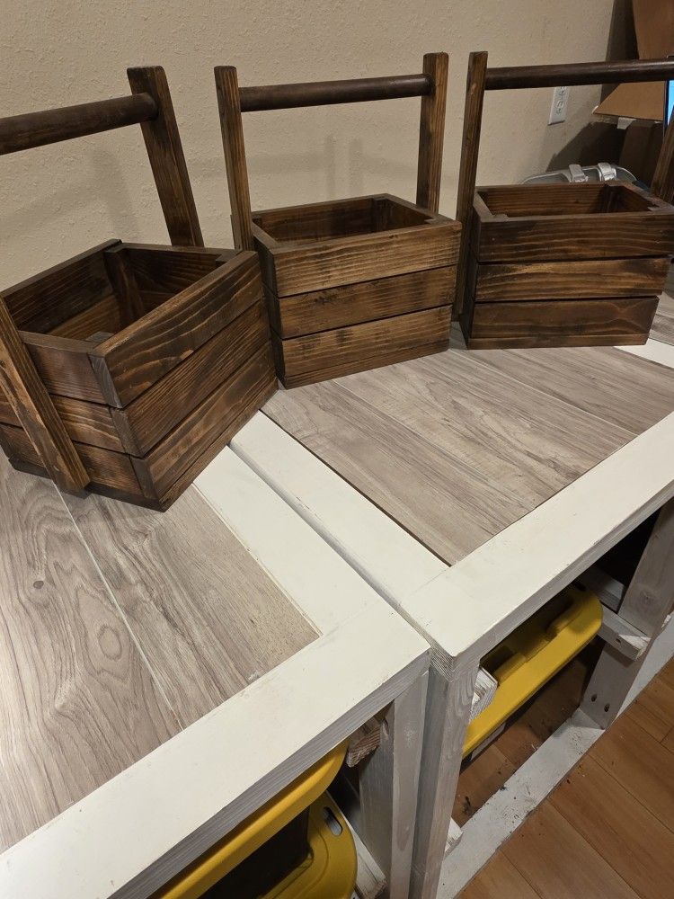 These handmade crates with handles stained with dark walnut stain are 10 inches long 8.75 inches wide and7 inches deep. They are 15 inches tall from the bottom outside of crates to top of handles. $40 for 3 crates. Click on my name to see the rest of my woodwork great handmade items at a good price all prices are firm