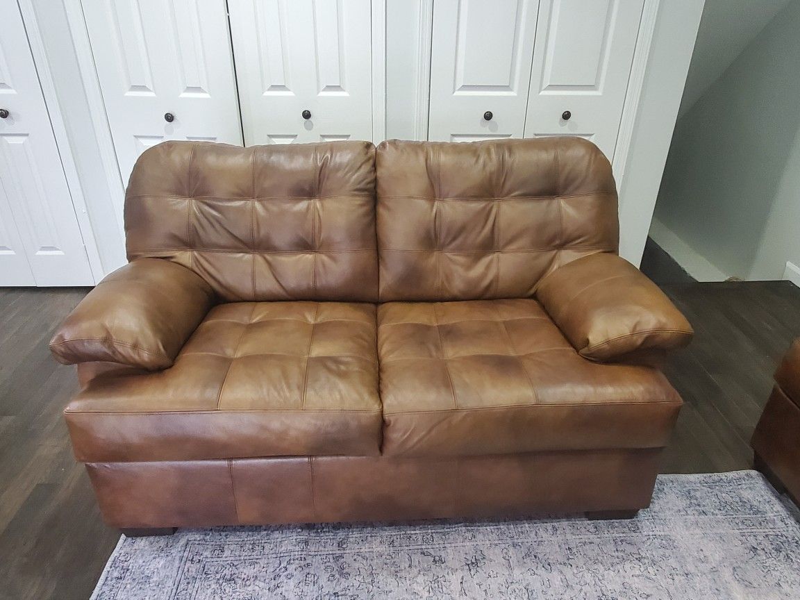 1 Raymour & Flangian loveseat. 100% leather. L 60 D37 H38. Hardly used and brand new. Sofa is too small and I wanted a bigger one but they don't so any refunds or exchanges once sofa is delivered.