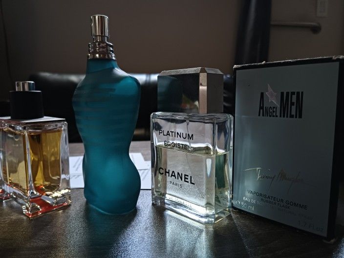 Terre D'Hermes Pure Parfum 2.5 Oz Jean Paul Gaultier Le Male 4.2 Oz (90% left) Chanel Egoiste Platinum 3.4 Oz (60% left) Thierry Mugler A * Men 1.7 Oz (80% left)