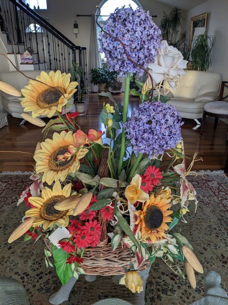 Natural looking large arrangement in a basket. Very beautiful.