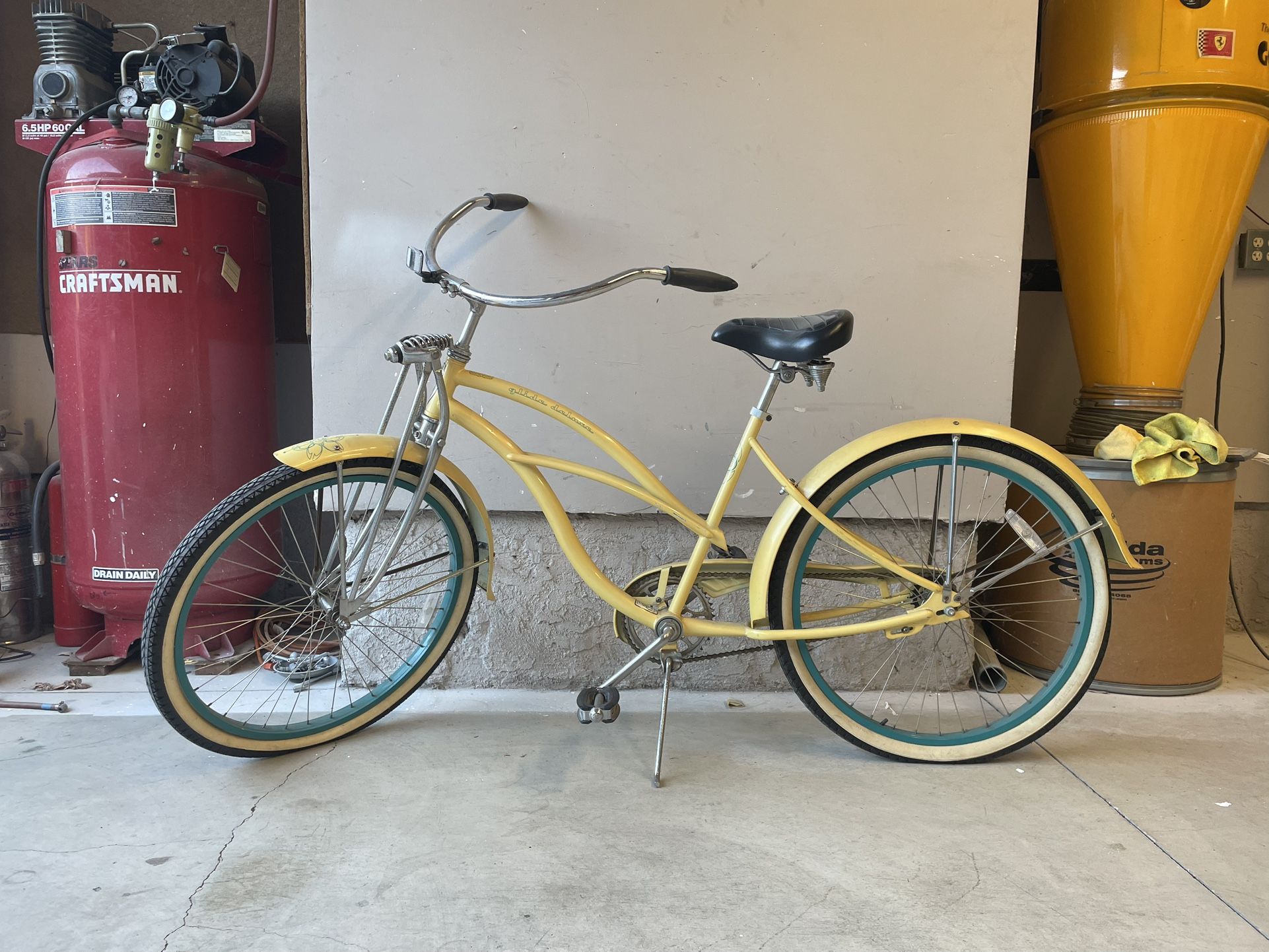 Yellow beach cruiser with springer fork, whitewall tires, wide bars, and comfy spring seat. Smooth ride and in good condition.