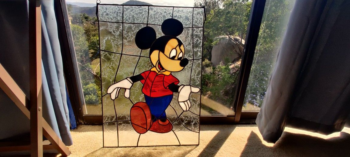 Beautiful Mickey mouse stained glass panel, leaded and hand assembled. Size 17.5" x 25" Mickey is wearing red shirt and blue pants. Great for a Disney fan, nursery, themed room, or window display. In good condition, top corners have pulled away from the glass, see detail pictures. Local pickup only.