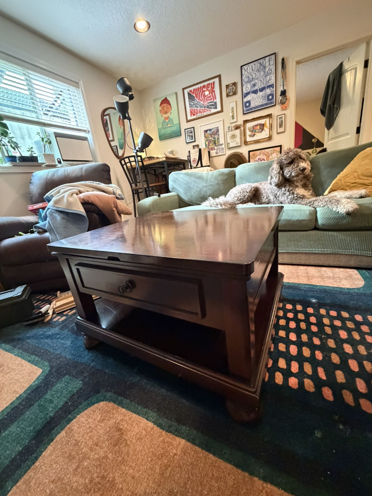 A great coffee table I just don’t have room for! It has plenty of scuffs on the surface, but is solid wood and the lift mechanism works great! 32” x 28” by 20” high.