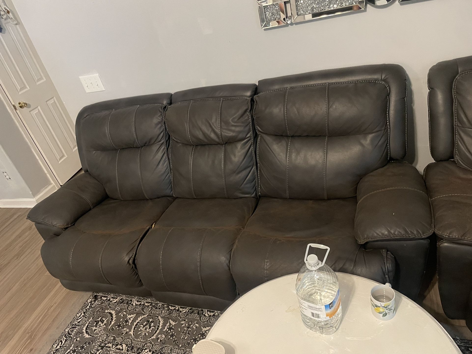 Leather they still strong but color it’s fading in the two seater the lazy boy there is something wrong in the leg it’s fixable don’t ask me to bring to u I don’t have a truck or anything u must come get them