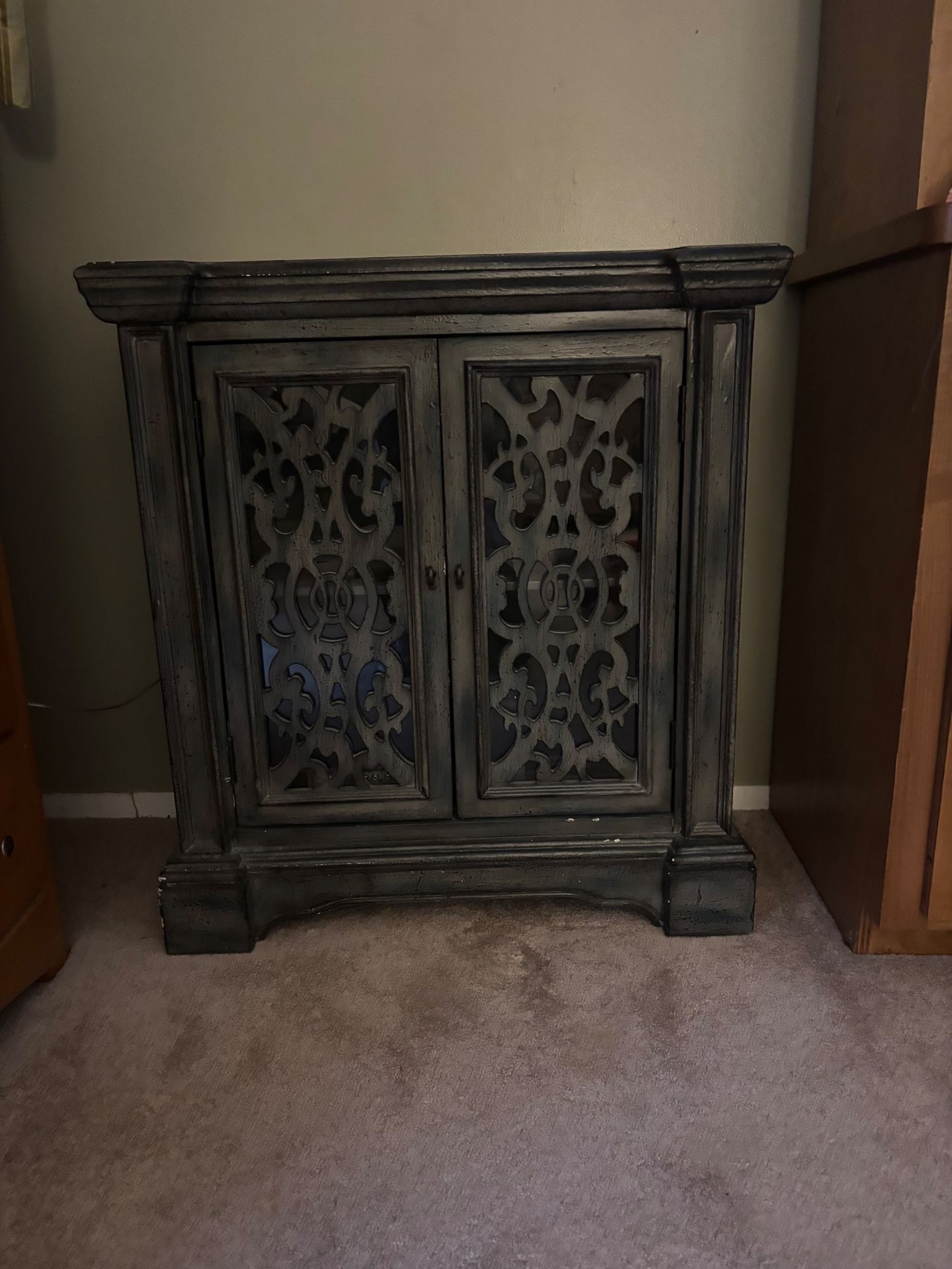 BoHo-style accent cabinet with decorative cutout glass doors and interior shelving. Solid, sturdy, and a great statement storage piece. Perfect for an entryway, bedroom, living room, or bar setup. Features: • Glass cabinet doors • Interior shelf • Solid, heavy construction • BoHo / Anthropologie / World Market vibe Condition: Good overall condition with normal wear. Clean inside and ready to use. Overall Measurements (approx.): 2.8 ft W × 1.3 ft D × 2.5 ft H (33.5” W × 15.5” D × 30” H) 💰 $100 OBO — priced to sell 📍 Pickup only