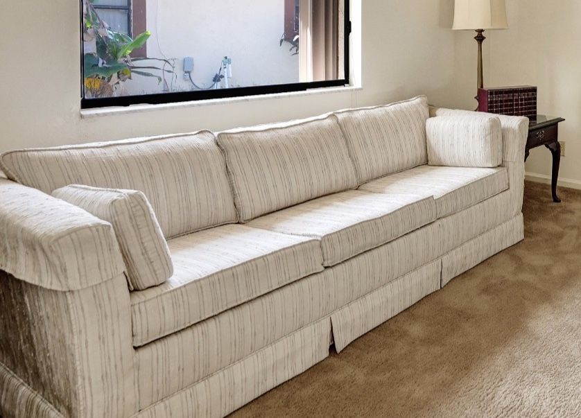 Vintage Stearns and Foster Fashion Convertible Sofa Sleeper Sofa Bed - Beige Striped Tuxedo Style Local 33414 Pick Up area, Add timeless style and extra sleeping space to your home with this vintage Stearns & Foster Fashion Convertible Sofa. -Brand: Stearns & Foster (known for quality bedding and upholstery) -Style: Tuxedo‑style convertible sofa / sleeper sofa bed -Color/Pattern: Beige with subtle vertical stripe -Function: Seats comfortably by day, converts to a sleeper bed for guests Features: -Tight back and seat cushions for a structured, tailored look -Sturdy vintage frame with classic proportions -Versatile neutral tones that work with most color schemes Perfect for a living room, guest room, office, or small apartment where you need both seating and an extra bed. This is a true vintage piece, so expect minor wear consistent with age, which adds to its character and charm