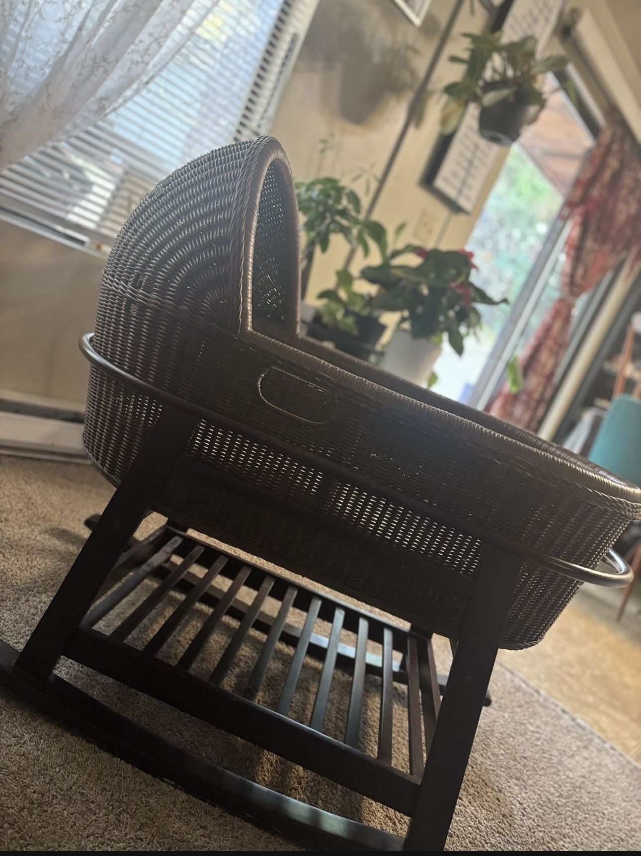 Brown baby bassinet . Clean house environment. no tears no broken pieces . comes with bassinet mattres. well taken care off you can zoom in the pictures and look that its in great condition . my baby greww out of it so no longer need