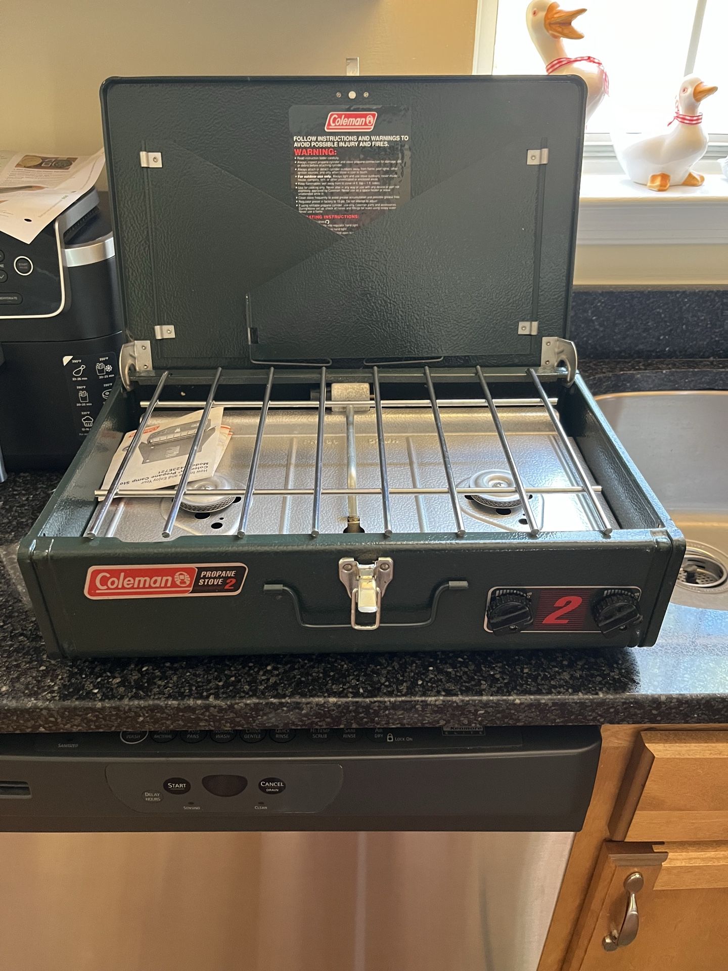 Brand new never used Coleman 2 burner camping stove. Perfect for the beach or camping.