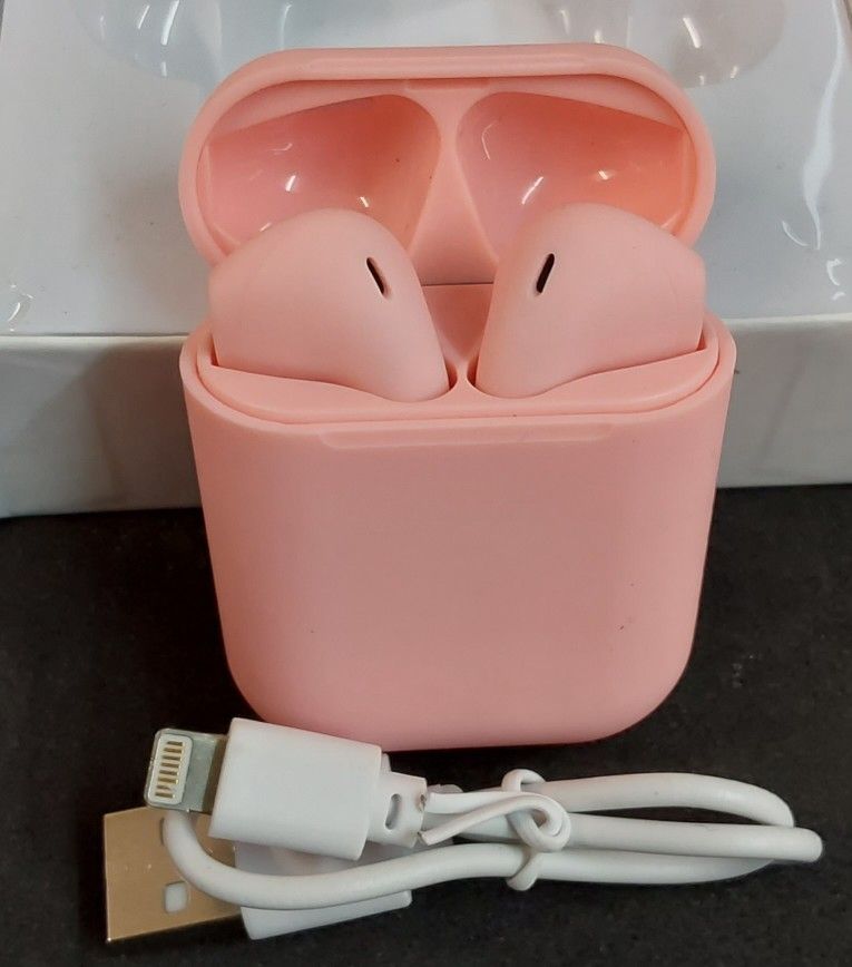 Pink auto connect wireless Earbuds, easy to use, works with Android or iPhone. Color goes great with correct outfit. Complete with charger, Opened one to Show