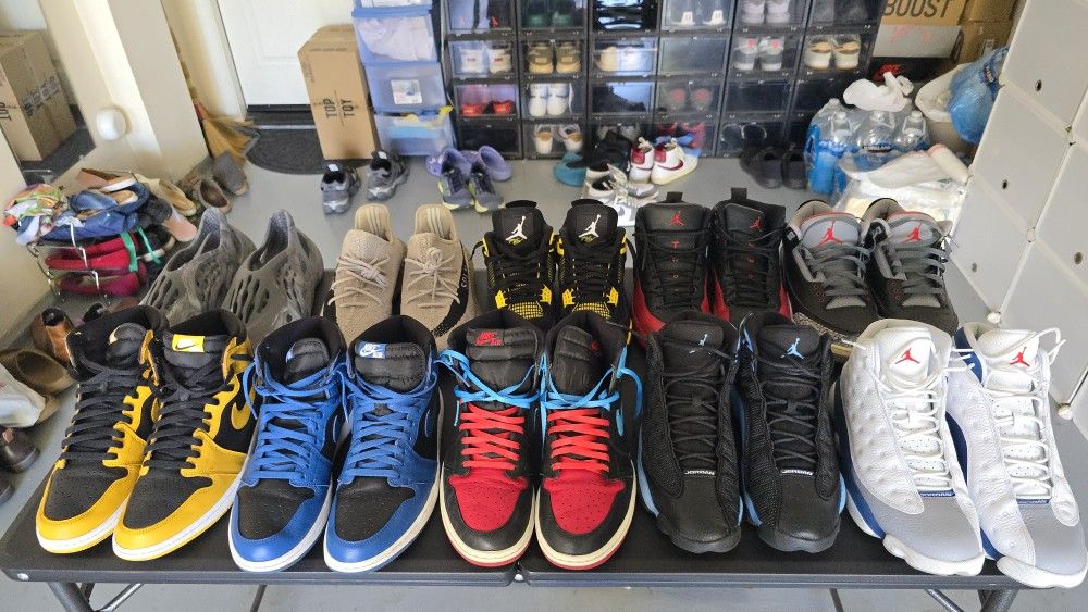 Selling my used shoes some are still in mint skme are still above average condition will give discount if buying more than 2. 800 for all of them Or Jordan 1 pollen sz 12 8.5/10 - 110 Jordan 1 marina blue sz 12 8.5/10 -110 Jordan 1 NC-CHI sz 11.5 8/10 -50 Jordan 13 UNC sz 11.5 9/10 -120 Jordan 13 French blue sz 12 8.5/10- 110 Jordan 3 black cement sz 11.5 7/10- 70 Jordan 12 flu game sz 11.5 7.5/10- 80 Jordan 4 black thunder sz 11.5 9/10- 140 Yeezy boost 350 v2 slate sz 12.5 9/10- 120 Yeezy foam runner 9.8/10(worn once)- 100 Trying to get rid of all my shoes. Since I don't use em anymore