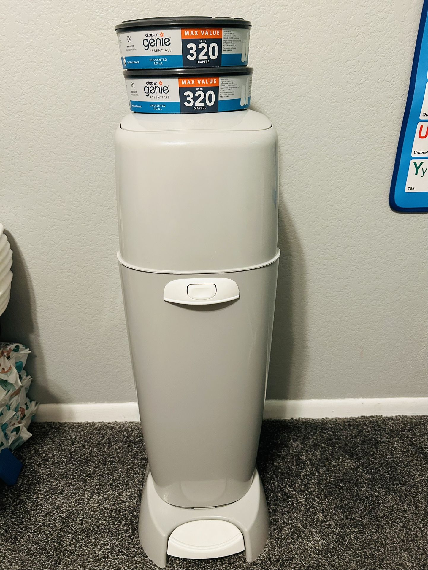 Playtex Diaper Genie Complete w/2 Bag Refills I don’t need this trashcan anymore. It’s in great shape. Don’t have anymore carbon filter odor eliminator & deodorizer refills that go on the inside of the lid, but, honestly, I couldn’t tell a difference when using them. This is a light grey & white. I can’t find the grey being sold anymore. Like new condition Retails for $60 Selling for $30