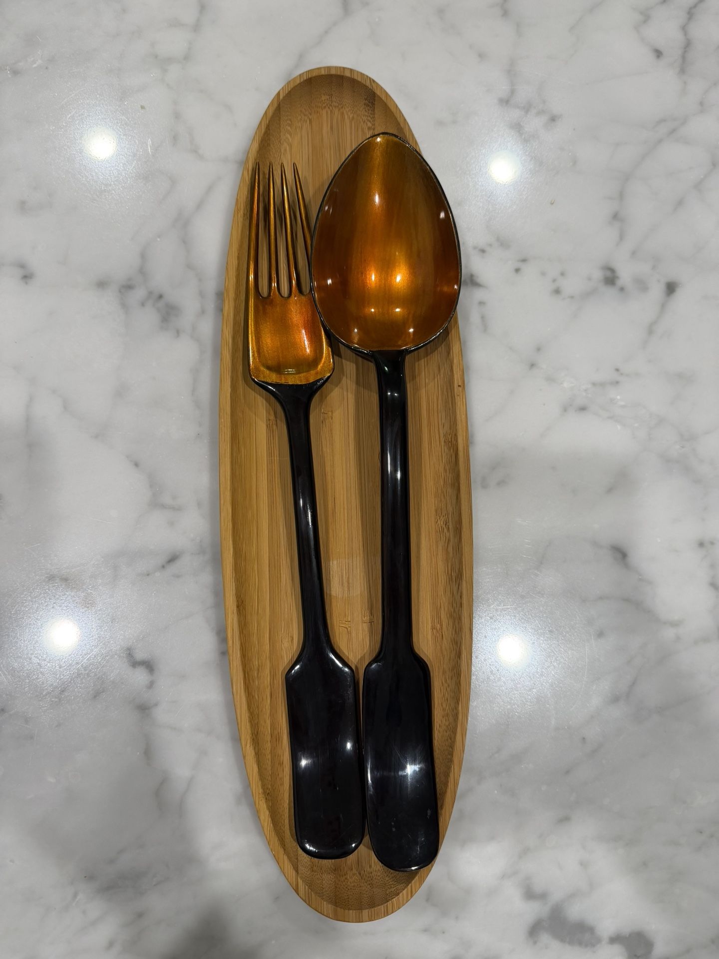 Decorative serving utensil set for home use. Includes two orange serving pieces and an oval wooden stand for storage. The handles are made from a smooth composite material with a glossy finish. The stand is made of wood. Suitable for serving or display. Brand: likely Lily Juliet (personal item, not affiliated) Used condition. Clean and intact. Pickup in Santa Monica. Message with any questions. Check out my other listings!