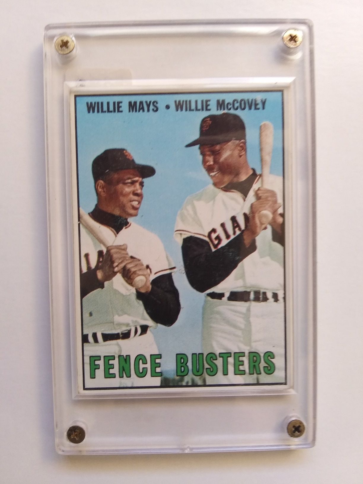 Beautiful and iconic vintage 1967 Topps baseball card featuring Hall Of Famers Willie Mays and Willie McCovey. This was originally purchased back in the 1980's at the National card show in Chicago. Still in its original lexan plastic protective jewel case from back then.
