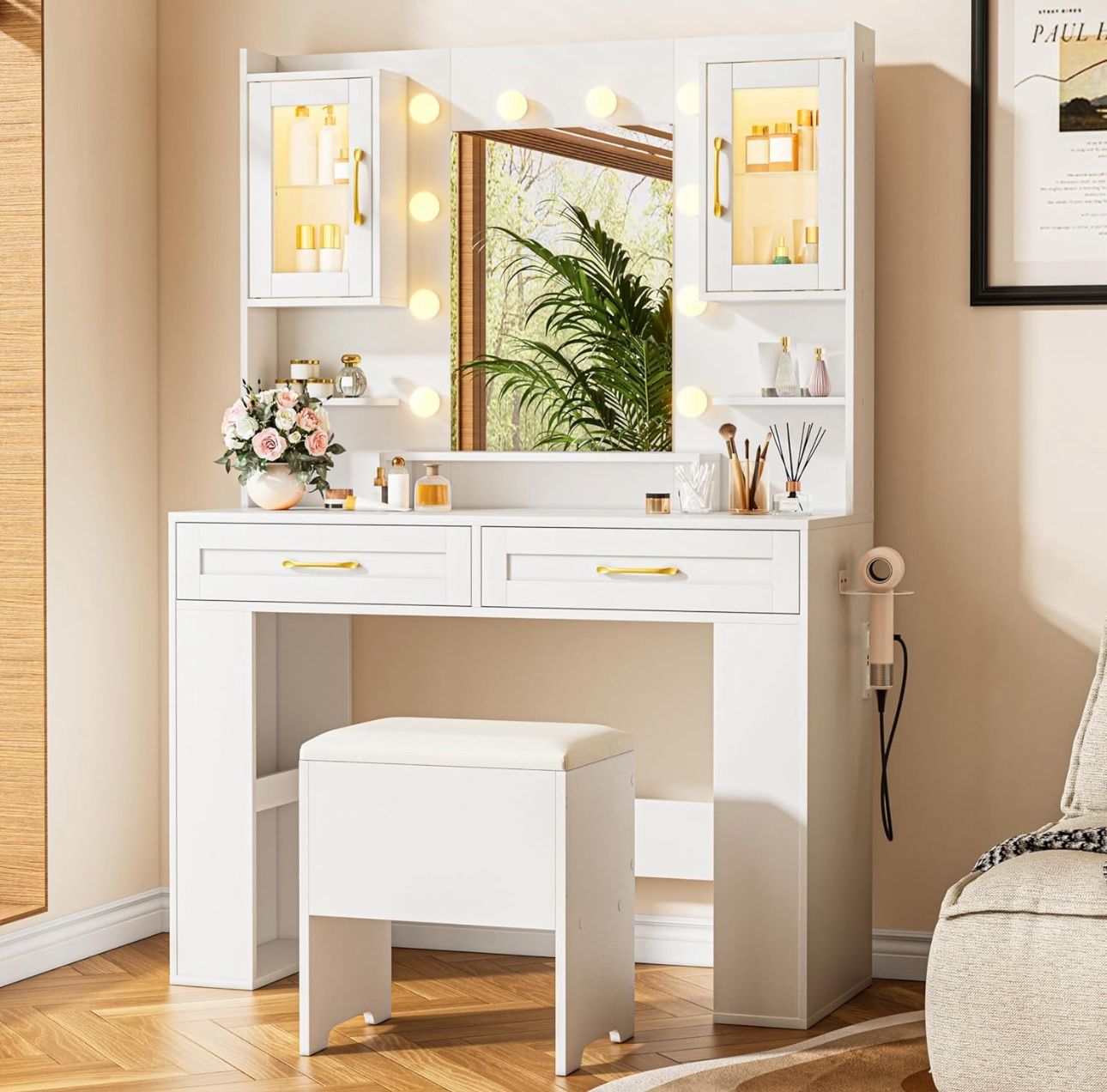 White Vanity Desk with Mirror and Lights, Makeup Vanity with 2 Clear Glass Display Cabinets