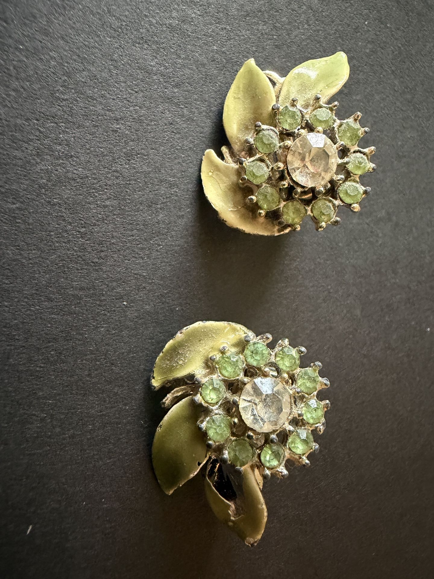 Vintage 1950’s green enamel and rhinestone clip-on Earrings ! Beautiful!