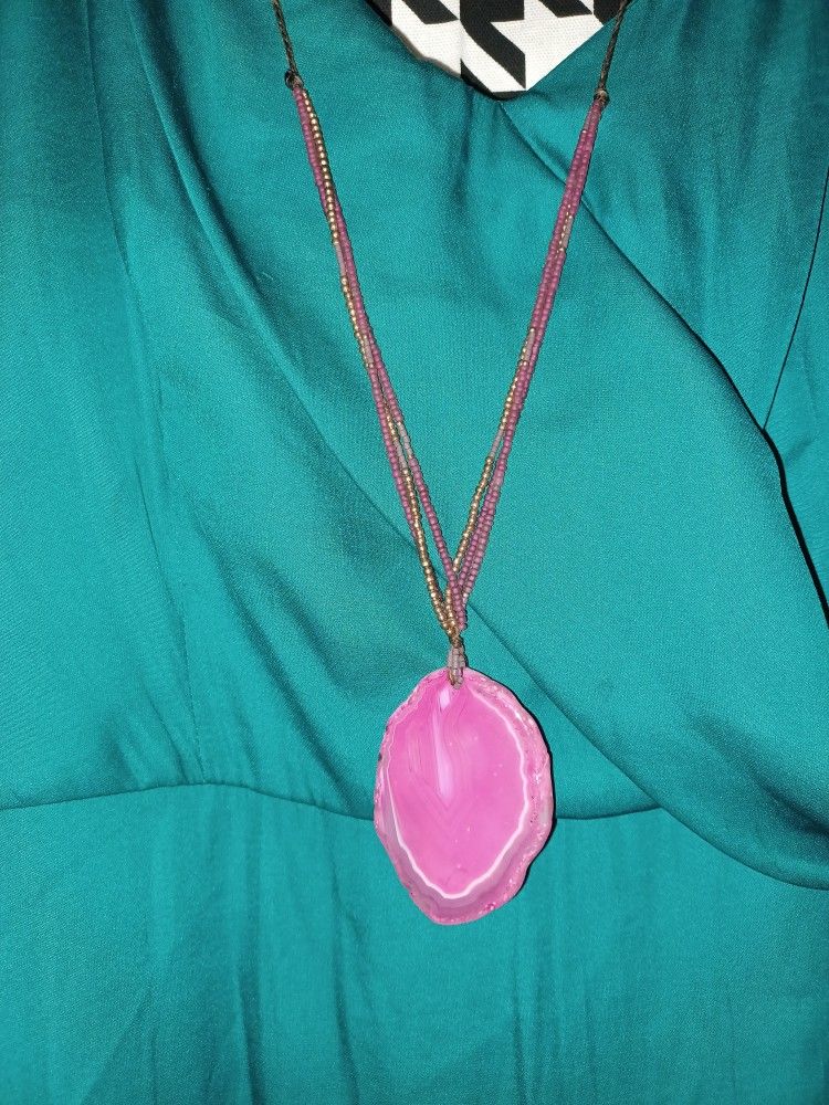 I have ALOT of jewelry I am letting go of. Some of it I made, some others hand made , and alot of it is precious/semi precious metals and stones made by registered jewelers from all over the world. If you want to bundle and buy I can offer lower prices. This is grey/ fuchsia agate geode slice (1.5 inch tall , 1 inch wide ) It's attached to multiple beaded beaded strings that converge into one singular string that is adjustable for sizing and has more beading on on the ends I made this piece so I can say with certainly6 y. that it is one of a kind. it is very unique, a headturner for sure.....it may seem simple in ita entirety but I spent alot of time making it. The quality on this piece is high. Unlike most of my pieces I do not have any matching pieces that go with it. Please make an offer. Feel free to contact me with any questions. Green dress is also for sale. Size 14 from Banana Republic NWOT