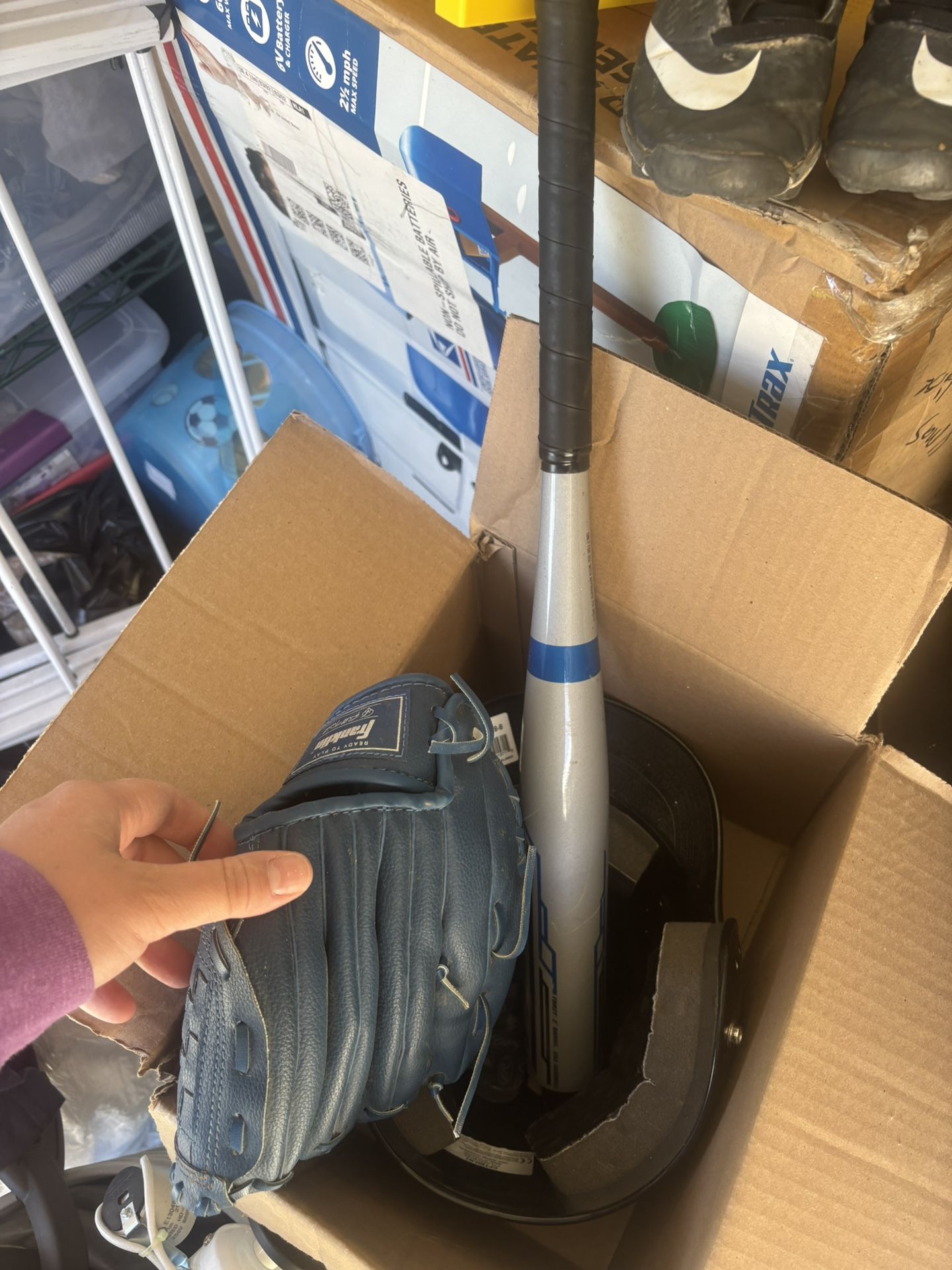 bat 24”, glove 9”, Nike cleats size 12, 2 baseball pants and shirt size 4