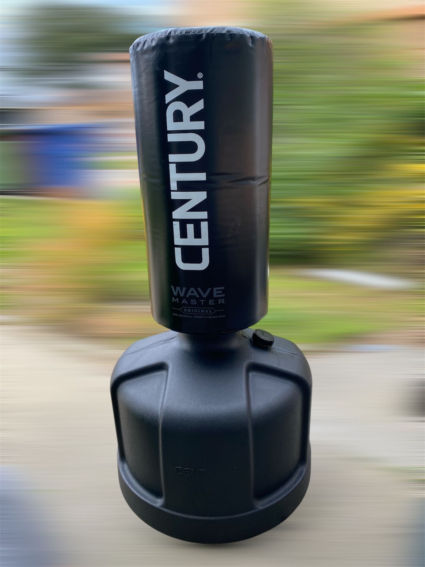 USED LIKE NEW • Freestanding Design: This is Century's original freestanding heavy bag, designed for developing kicks, punches, and strikes without the need for permanent fixtures. • Adjustable Height: Features seven height adjustments, allowing the striking surface to be set between 47 and 68 inches tall. • Durable Construction: Constructed with high-density foam for optimal resistance and rapid rebound during training sessions. • Stable Base: The large, rounded base can be filled with sand or water, providing stability and preventing tipping during intense workouts. • Portable Convenience: The rounded base design allows for easy relocation of the heavy bag without requiring permanent installation. • Generous Dimensions: The bag has a 13-inch diameter and a 26-inch striking surface, while the base measures 24 inches in diameter and 19.5 inches in height. • Substantial Weight: When the base is filled with water, the heavy bag achieves an approximate weight of 270 pounds for robust training.