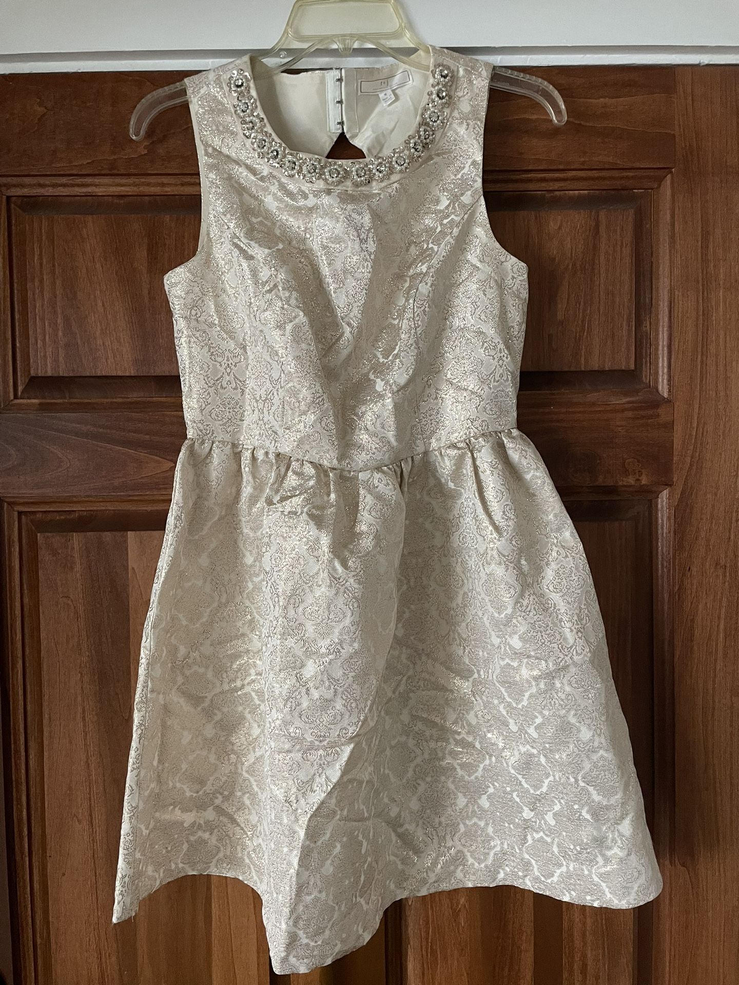 Beautiful detailed gold dress with peek a boo back. Great for a wedding. Size medium with no give or stretch. But fits like a small.