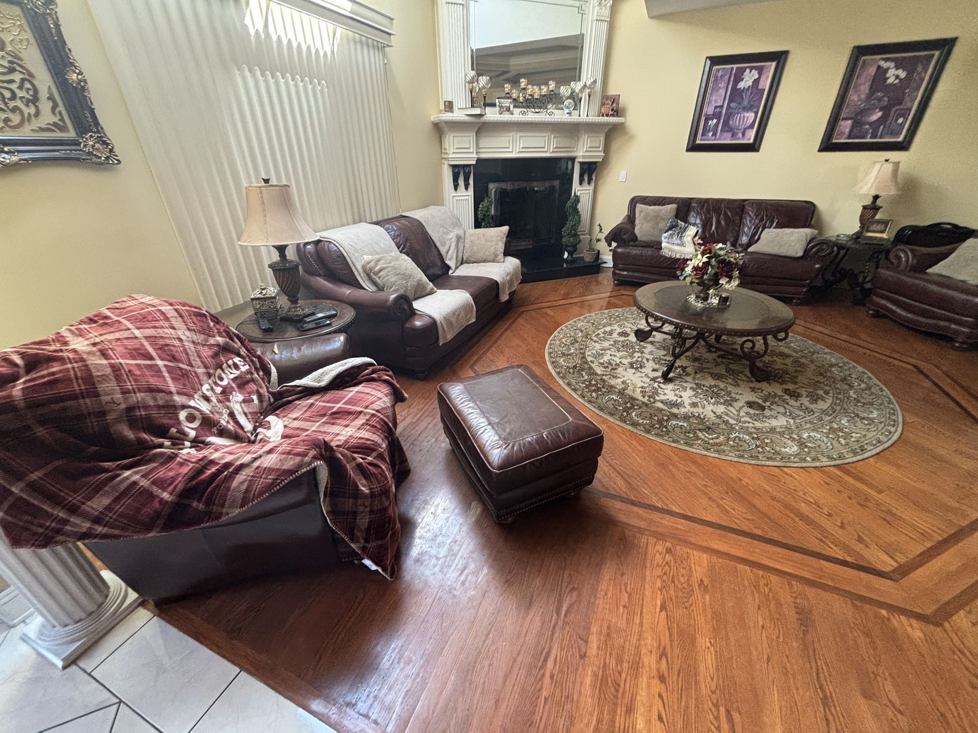 Good condition living room set 5 piece couches leather(small tears in some) 2 coffee tables 1 center table Perfect condition tv with stand 2 lamps Price is negotiable I could sell separately if wanted