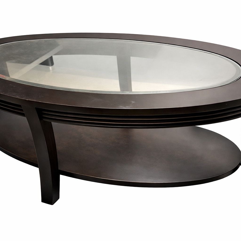 Elegant oval coffee table featuring a dark espresso solid wood frame with a tempered glass top. ✔ Thick oval glass insert ✔ Sturdy solid wood construction ✔ Lower shelf for extra storage ✔ Modern / contemporary design ✔ Very stable and heavy – quality piece Perfect for living room, apartment, office, or staging. Normal light wear from use (see photos), glass intact and structurally solid. Dimensions available upon request. Local pickup only. Serious inquiries welcome.