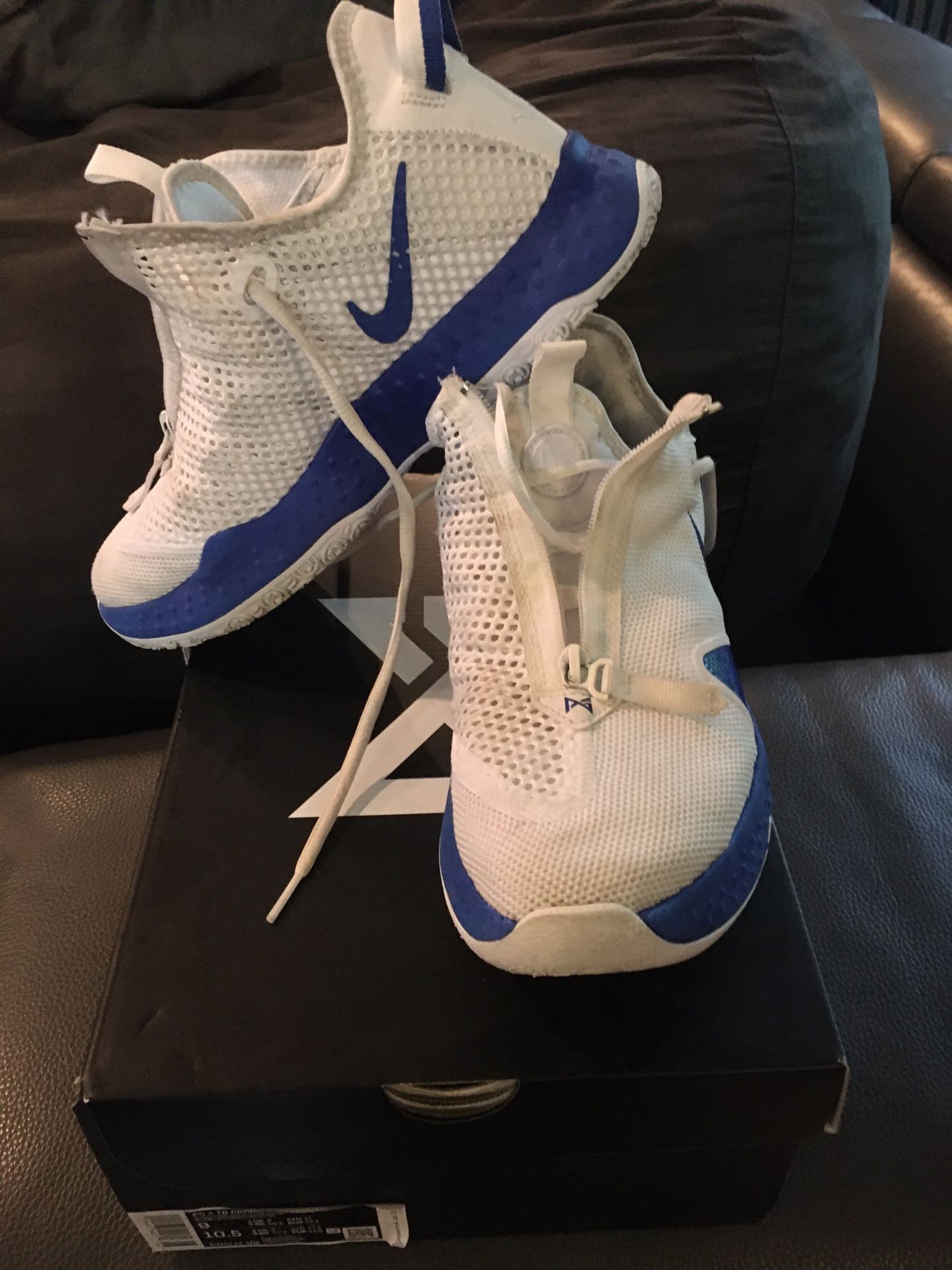 PG 4 white with Royal Blue. Lightly worn on basketball court .