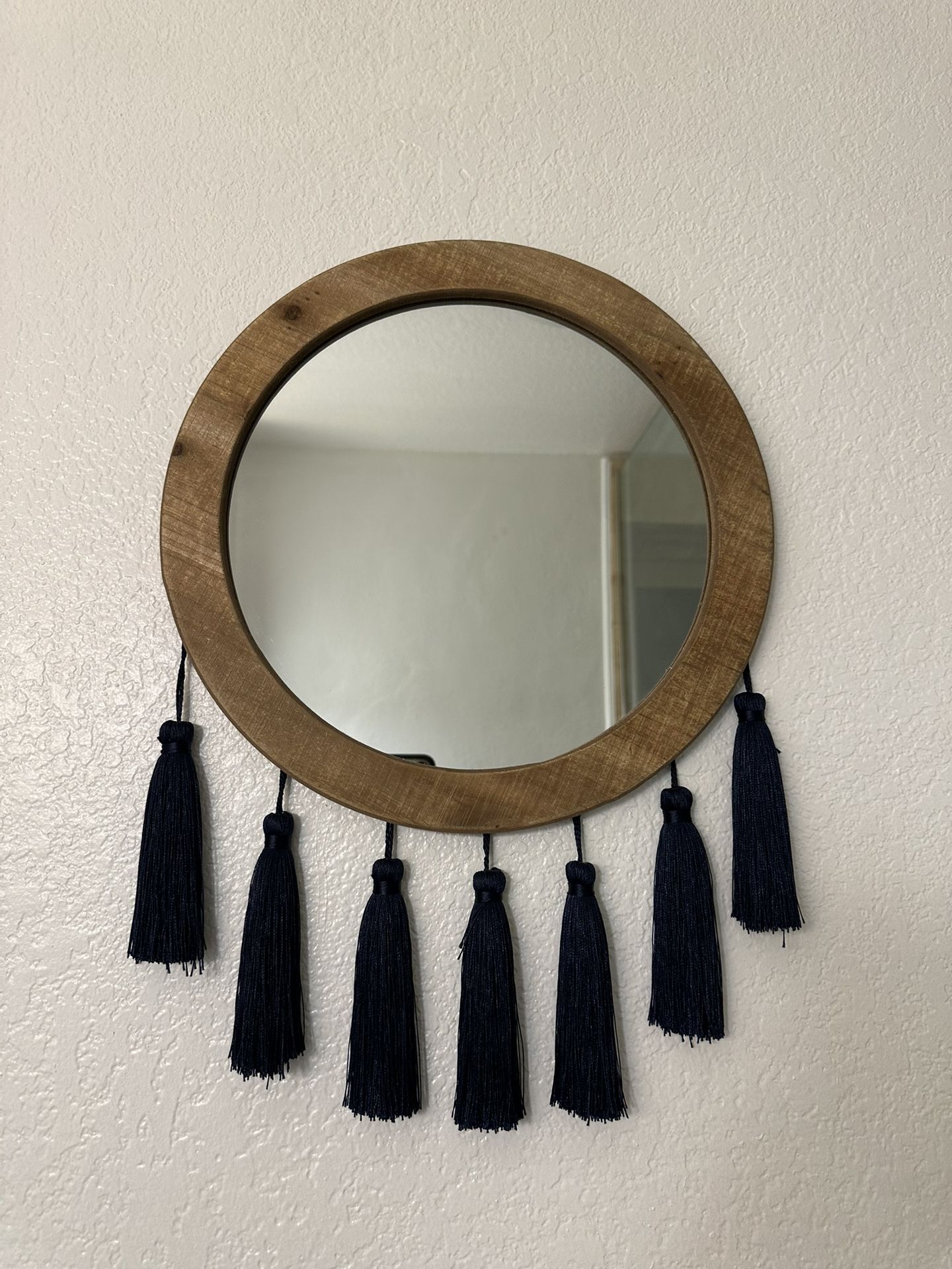 Cute rustic mirror with navy blue fringe. 13in. Pick up in Round Rock.