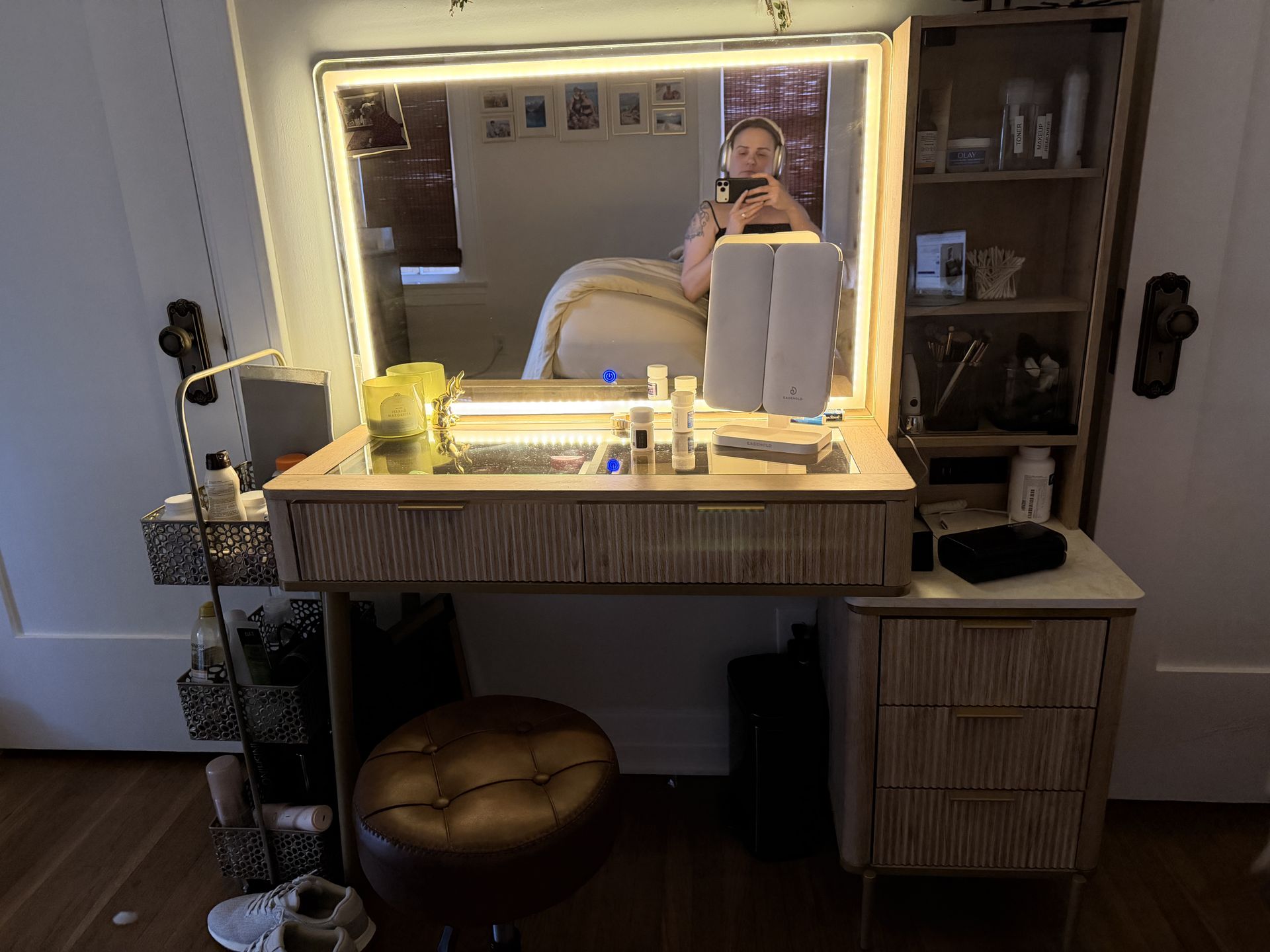 Makeup vanity with 3 light settings and tons of storage. 48 inches (W) x 15.6 inches (L) x 53.6 inches (H). The stool is super comfy and moves up and down for height, fits underneath easily 12.8"D x 12.8"W x 20.5"H. Vanity originally $285, stool is $64