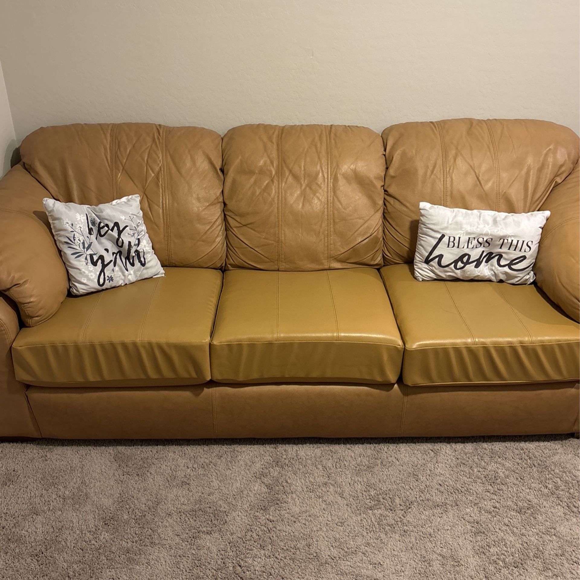 Tan Leather. Pet Friendly Home. Steamed & vacuumed upon pickup. Sofa: $150 Couch is comfortable and seat cushions were just reupholstered -Pet friendly home -Width: 90in Depth: 37in Height: 32in Seat Height: 16.5 Pickup only. San Tan Valley/Queen Creek Border.