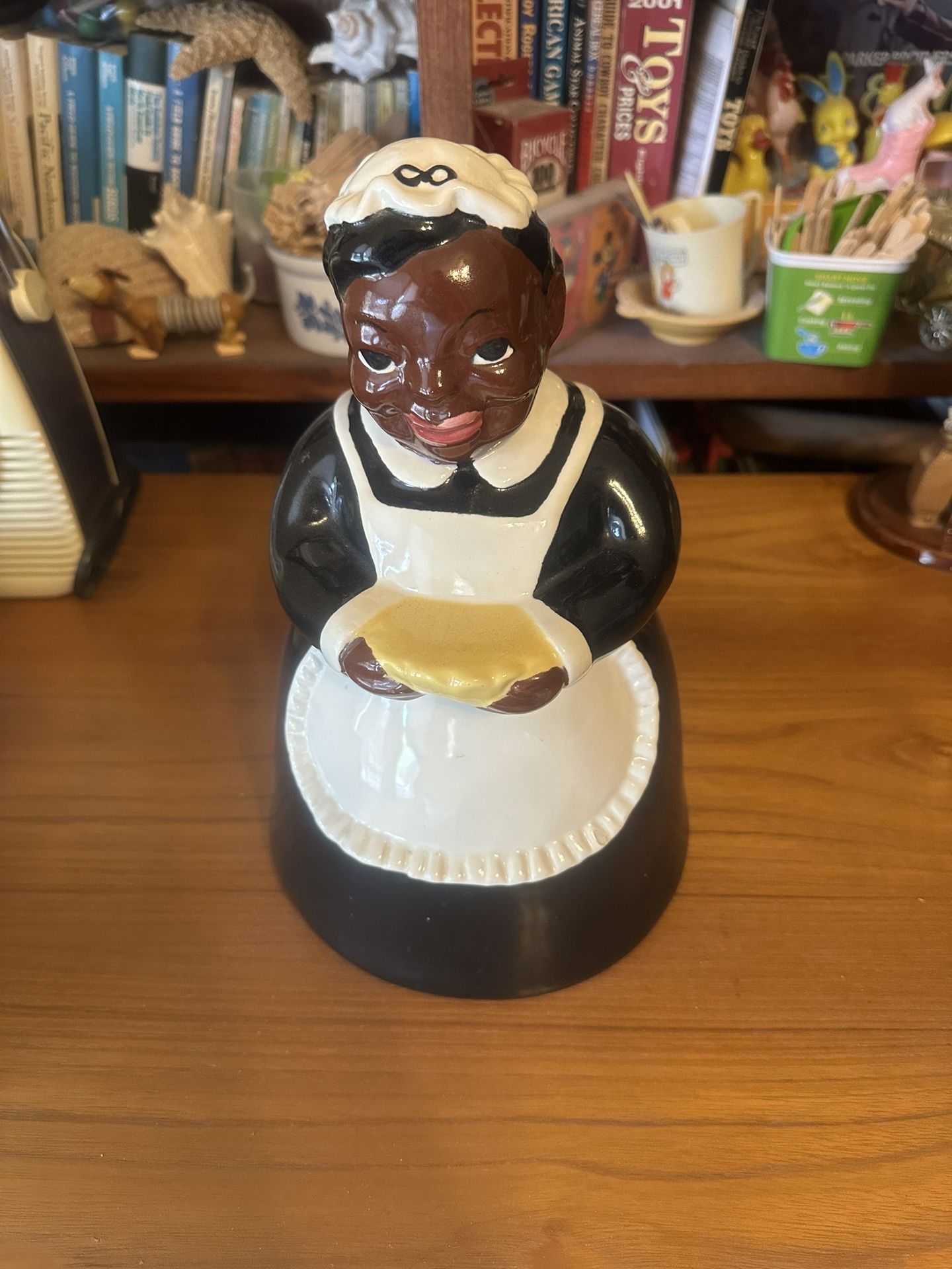 Extremely scarce 13.5" maid wearing formal uniform holding a pie collector cookie jar. By Brayton Laguna Pottery of Laguna Beach, California which is prominently stamped on its bottom.