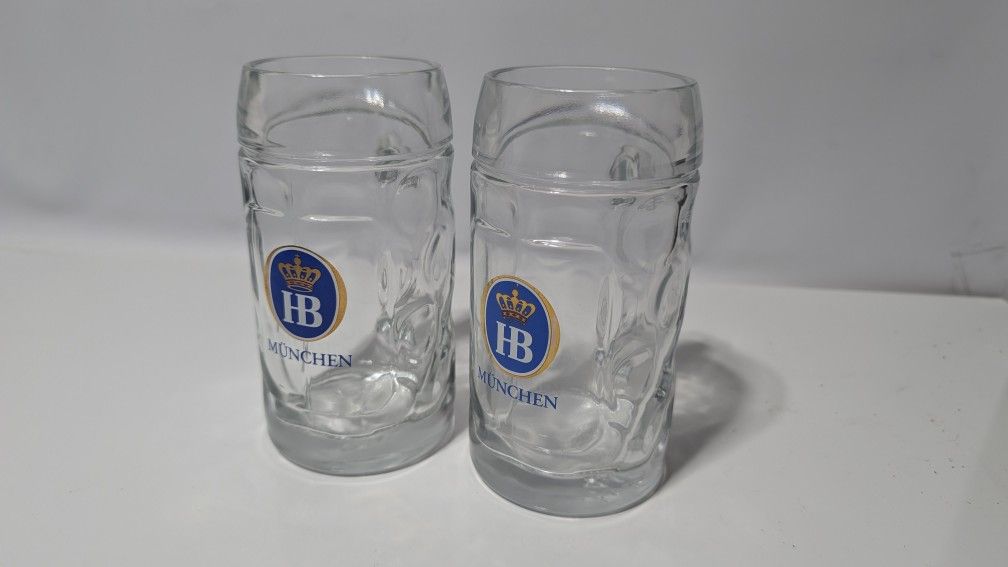 Pair of Hofbräuhaus HB München German Beer Steins 0.5L Dimple Glass Mugs with Handles