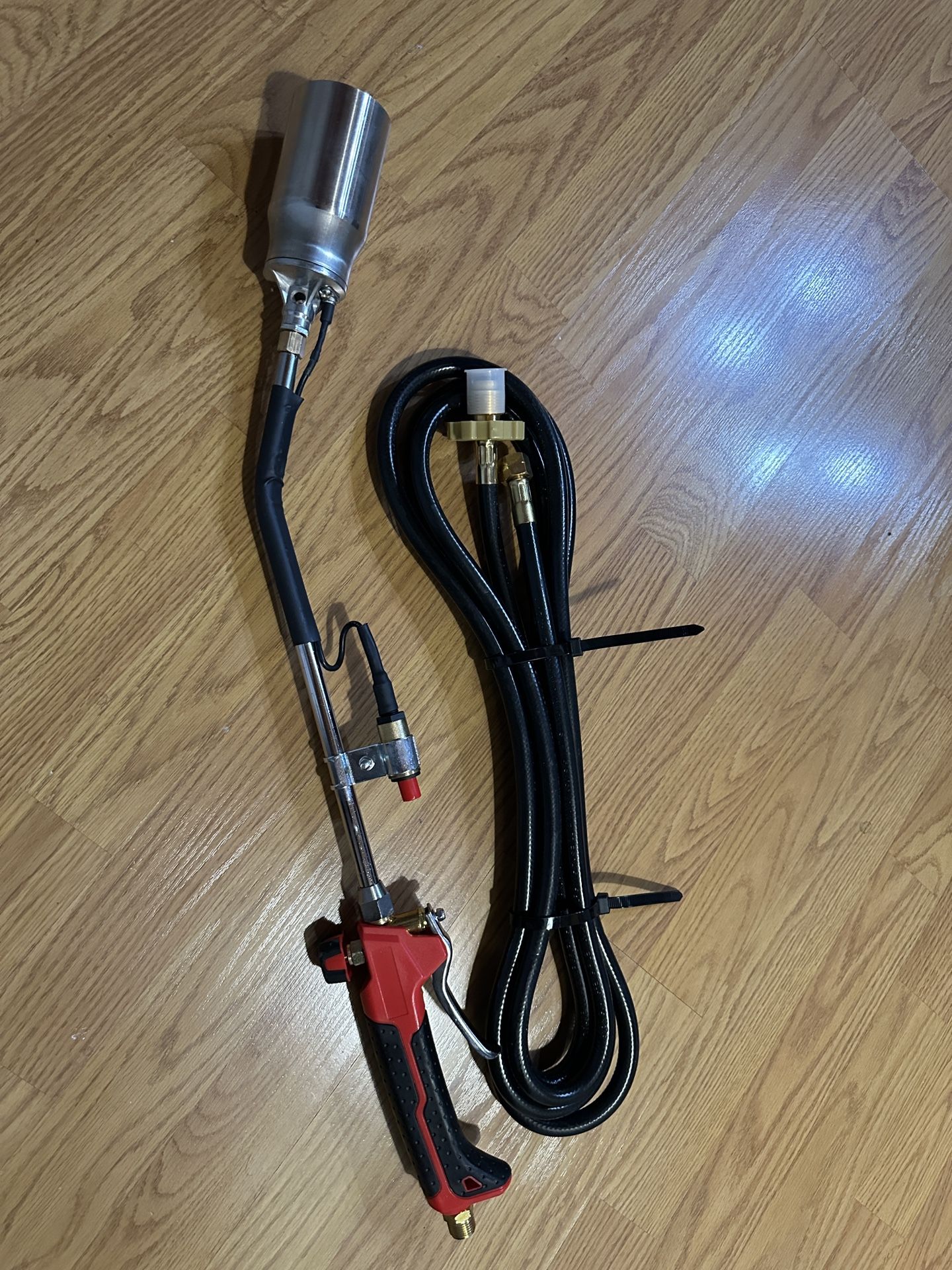 Heavy duty propane garden torch for outdoor maintenance and weed removal. Connects to a standard propane tank and is designed for clearing weeds along driveways, sidewalks, gravel areas, and other outdoor spaces. Features a durable handle with trigger control and built-in igniter for easy starting. Includes long hose and metal torch head for safe distance while working. Great for yard maintenance, landscaping, melting ice on walkways, or outdoor projects.