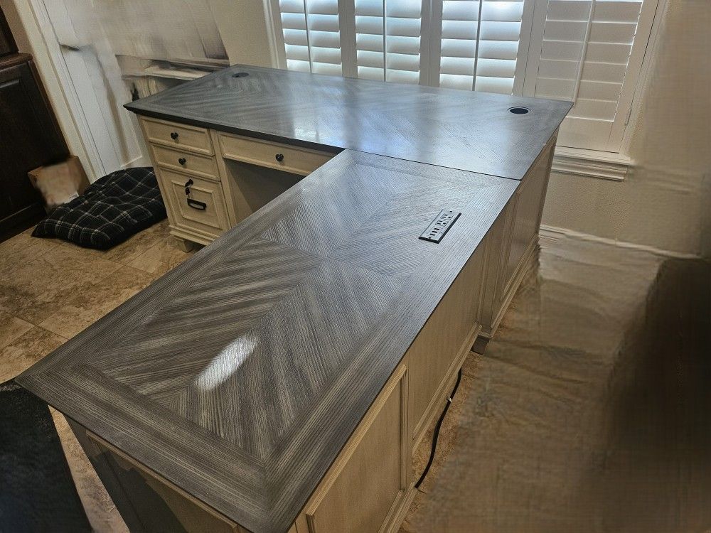 We're doing a moving away sale, going across the country so we need to lighten the load. A fully assembled Martin Office L-desk. Dimensions: 70" W x 31" H x 77.5"D. You can get more details by googling "Martin Furniture item# IMHF684RW" Disclaimer: the provided photos have a blur effect on the background objects. The desk itself is untouched. Note: this desk is heavy (363lb)! Disassembly is an option. Keep in mind that you'll need transportation that can handle a heavy load.