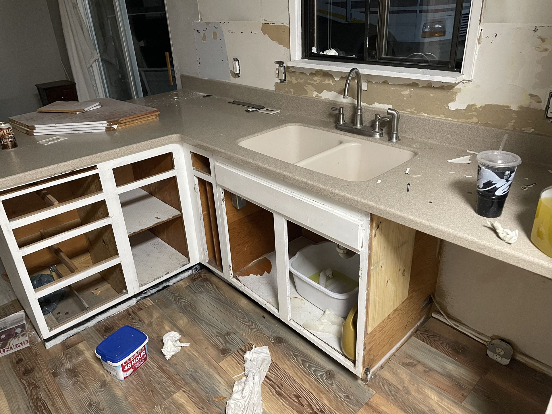 Solid polymer type counter with molded double sink and stainless steel faucet. Comes with cabinets as well. Come and grab 80$ takes it all. 100” long and 60” long on the end 40” wide on end and 36” wide on main stretch. Text first thanks (contact info removed)