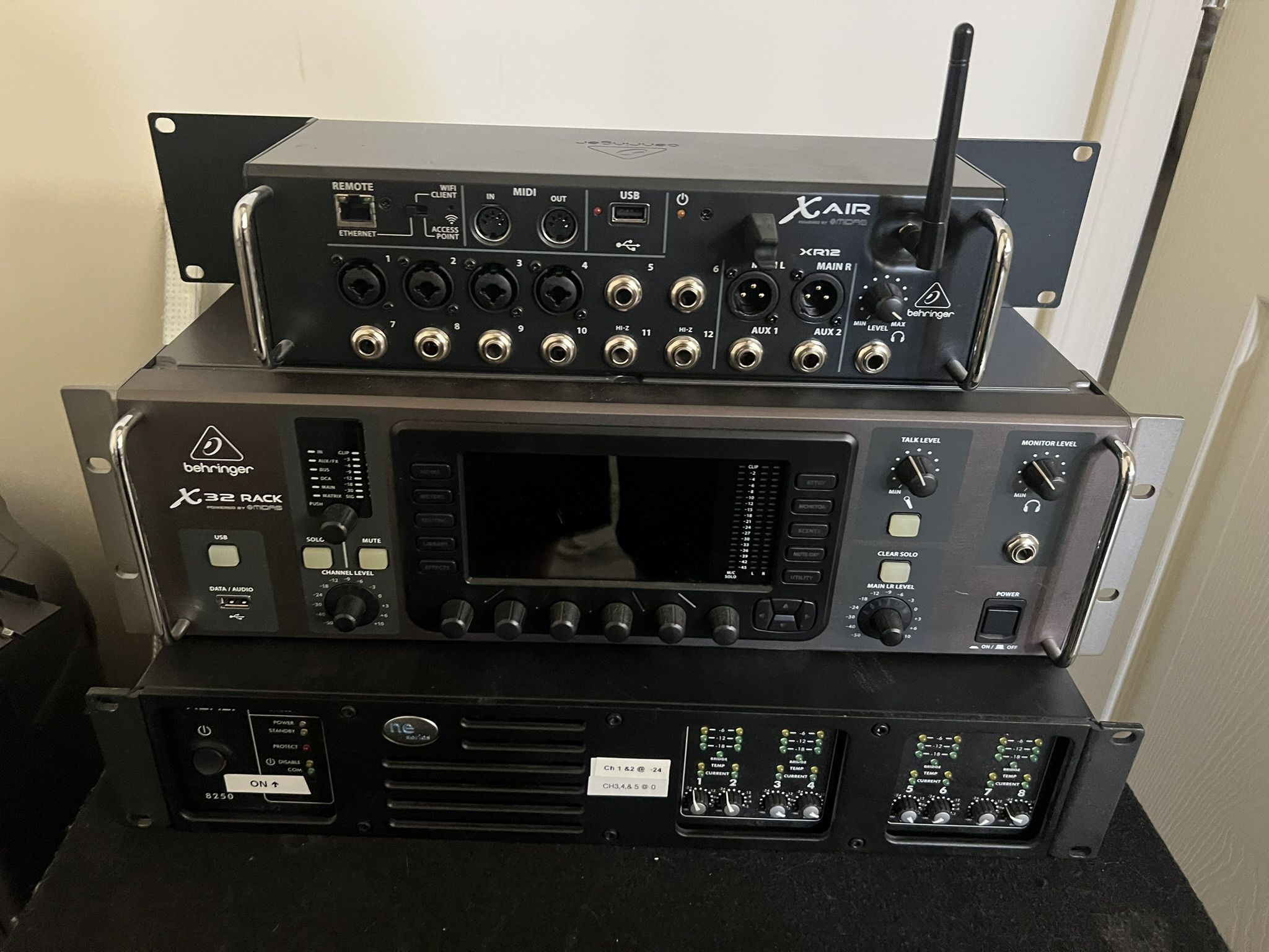 Behringer X32 Rack (rack-mount digital mixer) $500 + Xair12 Rack Mount $300, Other misc sound equipment items $700 for both
