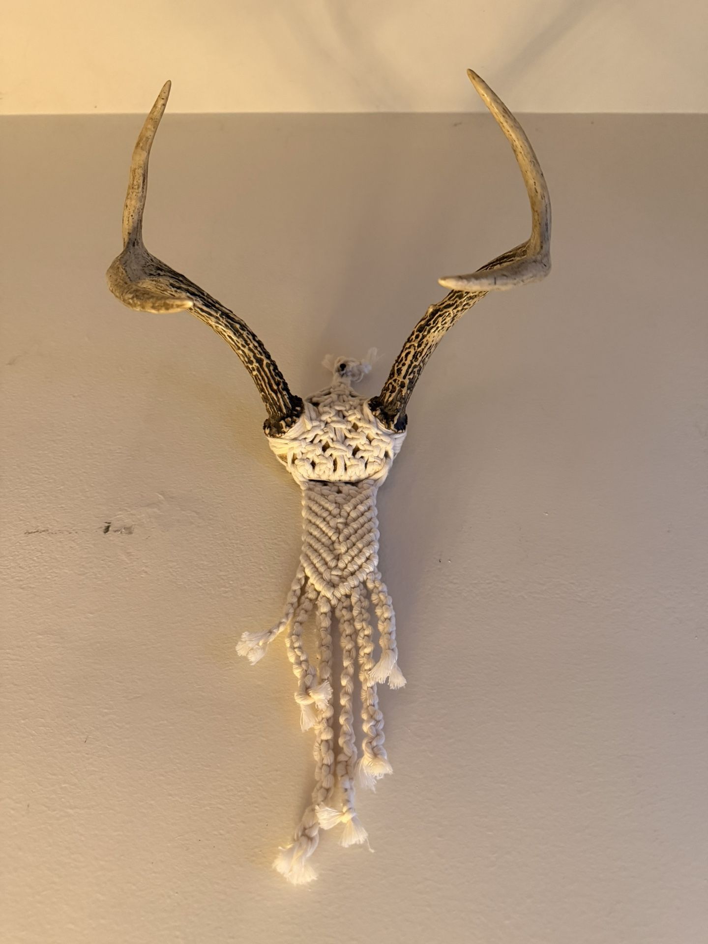 Real deer antlers wrapped in a handcrafted macramé design. Lightweight and easy to hang