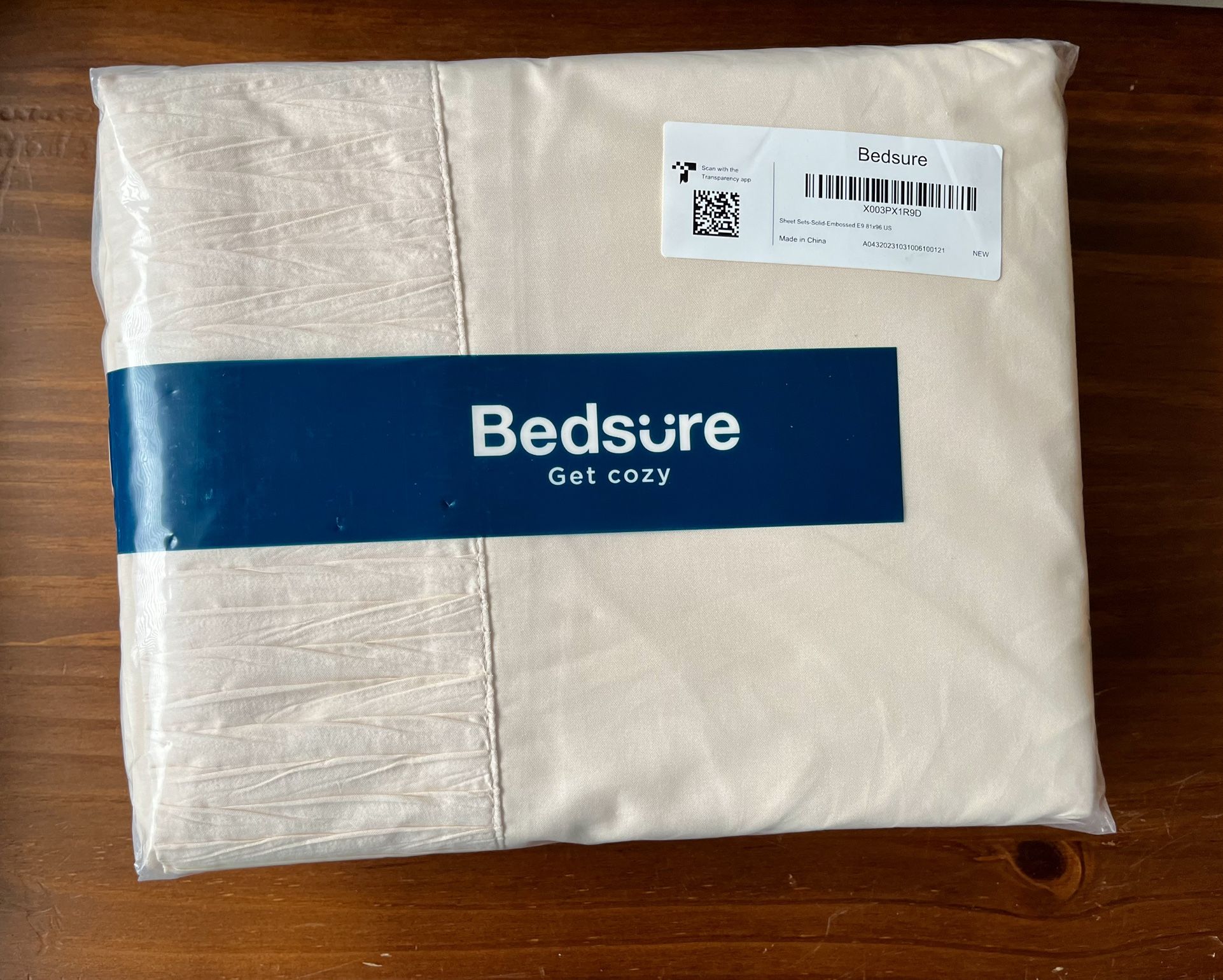Cream colored sheet set with Embossed detail 100 % Polyester Never Been Used. Brand New. Dimensions 81 x 96