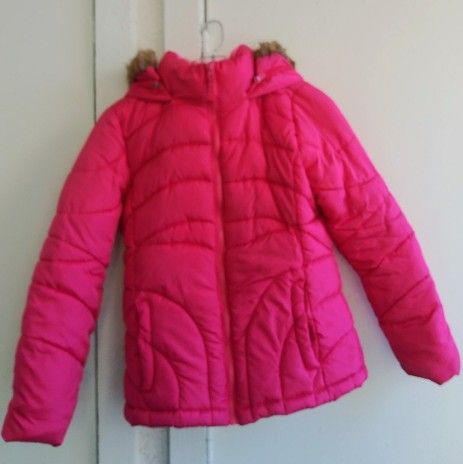 Hot Pink zip up Parka with pink quilted fur lining and faux fur hoodie border. SIZE: Girls Med-Large Wrong size, opened box, never used