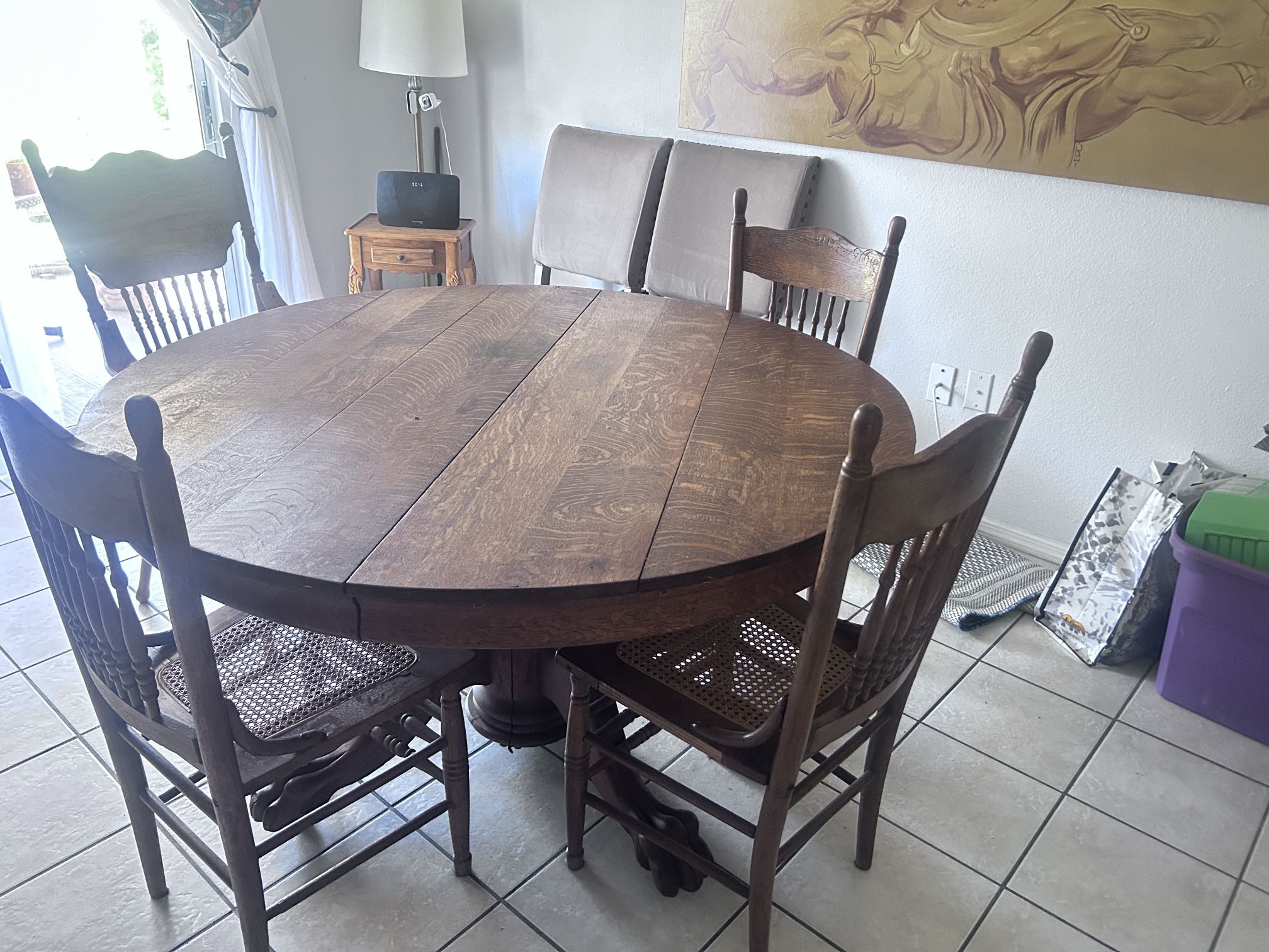 Table is 54 inches round and 30 1/2 inches in height. It is super heavy 1920s solid oak coffee and is on wheels on casters. There is 1 captains chair and 2 oak Kane chairs