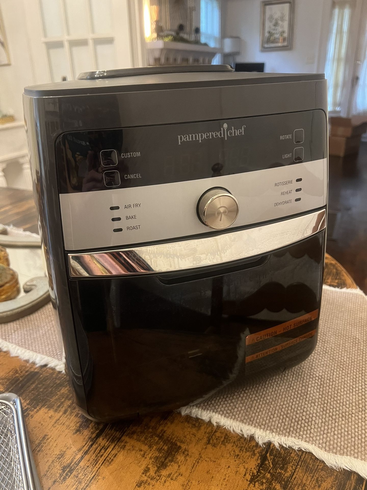 This is like new. Regularly $299. Family-sized 11.6-qt. capacity fits up to a 4 lb. whole chicken. Eight programmed settings: Air Fry, Bake, Roast, Rotisserie, Reheat, Dehydrate, and Rotate. Like a convection oven, superheated air circulates giving food a crispy texture. No preheating is necessary. Includes two cooking trays, drip tray, and a cooking guide. 14½" tall x 12 3/4" x 14 1/4".