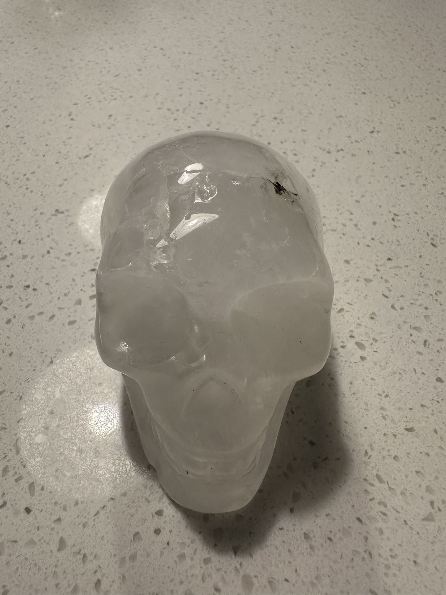 Quartz crystal skull for sale. Weighs 303g! Dimensions 3” x 2”.