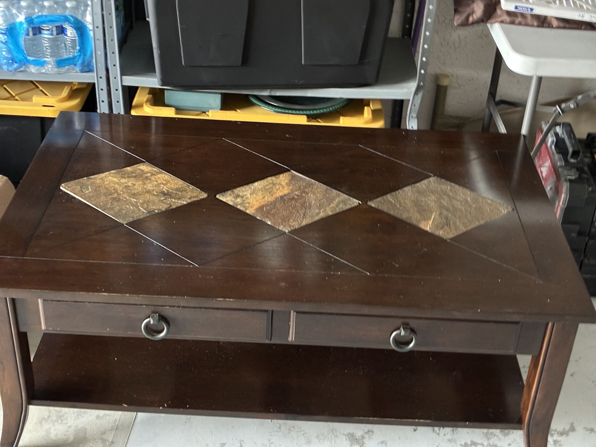 Solid dark wood coffee table with 3 stone inlays, 2 drawers and a lower shelf. A few little imperfections but overall in excellent condition. Table measures 9.5 inches high, 32 inches wide and 50 inches long.