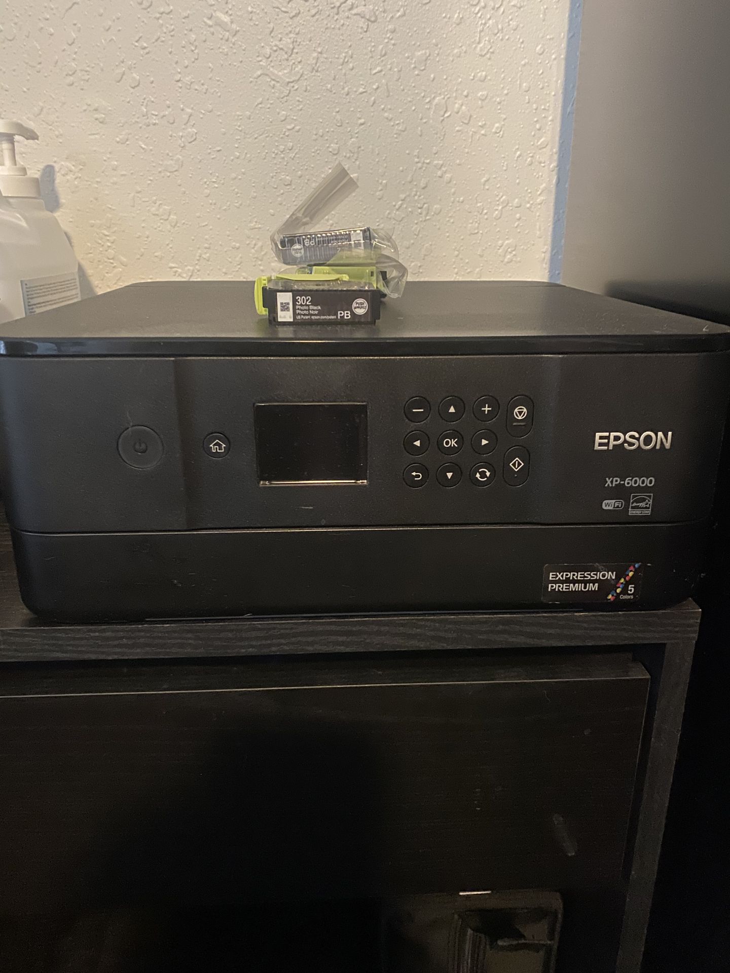 Epson XP-6000 printer with 3 cartridges of photo black ink. Works well just don’t need it anymore