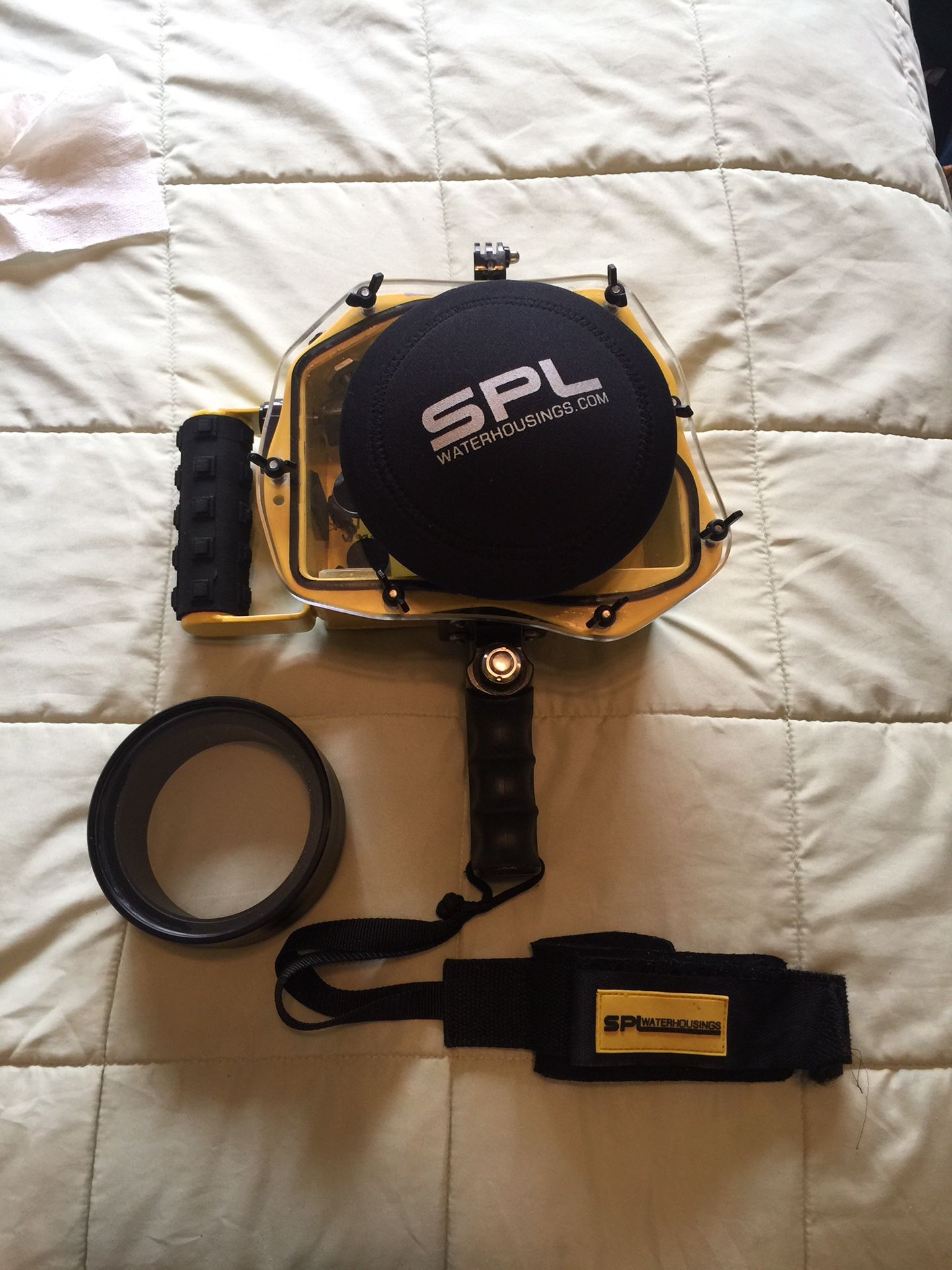 Good condition. Comes with a fisheye dome port and a 50mm port. Had lots of fun using it! Sad to sell it but need the money. Hit me up with any questions. Made for the canon 7d mark ii. Comes with silicone grease and extra wingnuts, and has a GoPro mount on the top for video.