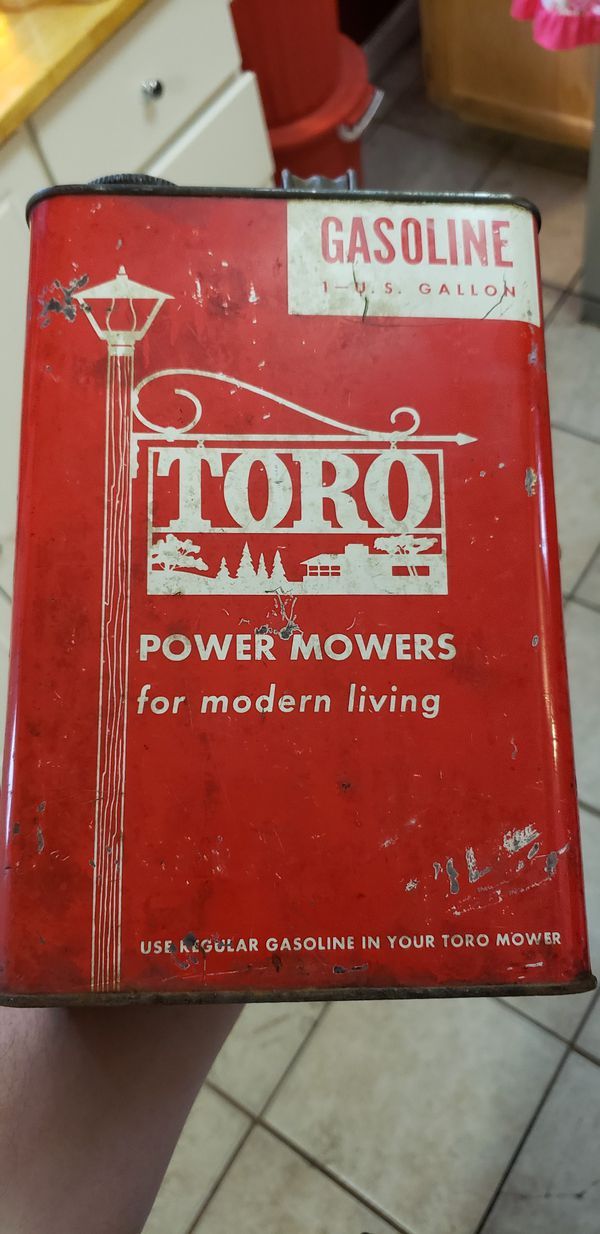 Vintage 1 Gallon Gas Can- Toro motors. Great design with the bull horns on side- no zipcodes or barcodes. Earlier piece. Some nicks and dings from years of use. Cant find another online $75 / Lorain pickup