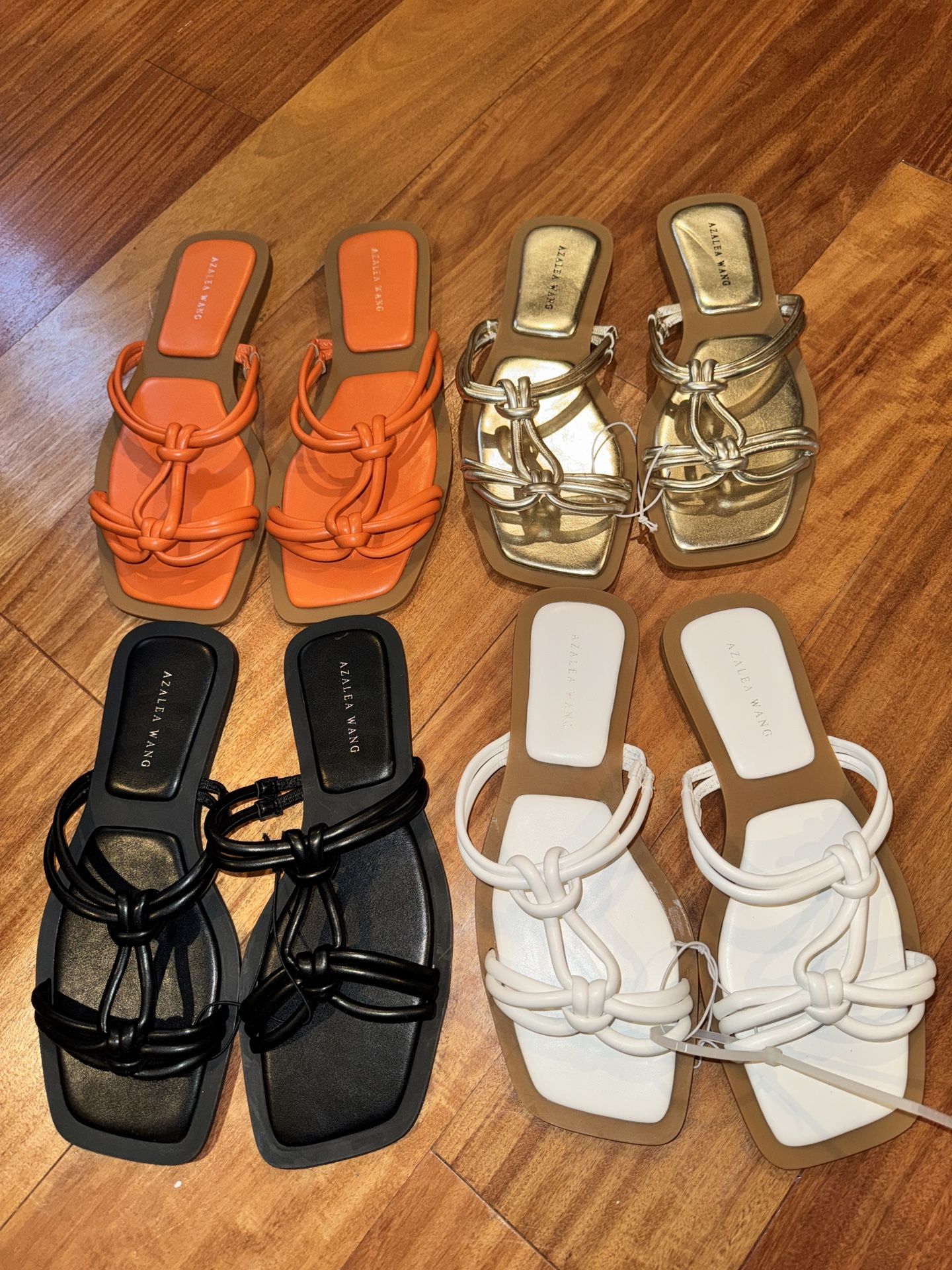 New WOB I have multiples colors and sizes of Azalea Wang Women's Tubular Straps Knot Flat Slide Sandals with square toe. Please see list below. They are perfect for Spring or Summer. They are new without box. Originally sold at Nordstrom department store. Size 7: 2 White, 3 Gold, 1 Black and 1 Orange Size 8: 2 White, 2 Gold, 1 Black Size 9: 1 Black Size 10: 1 Gold Size 11: 2 Gold, 1 Orange Size 12: 1 Black