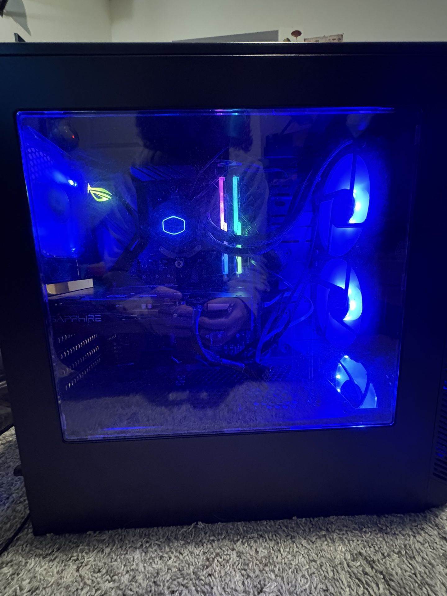 Old PC of mine. Fully functional and can still run modern games at medium settings, gets about 75-100fps in 1080p. Selling it after upgrading. SPECS: Ryzen 7 2700 CPU Sapphire 5500xt 8gb GPU 32gb DDR4 3000mhz RAM (TridentZ RGB) 2tb seagate HDD ROG STRIX B450-f motherboard Coolermaster 240mm AIO 2 solid blue LED 120mm case fans EVGA 500w Bronze PSU